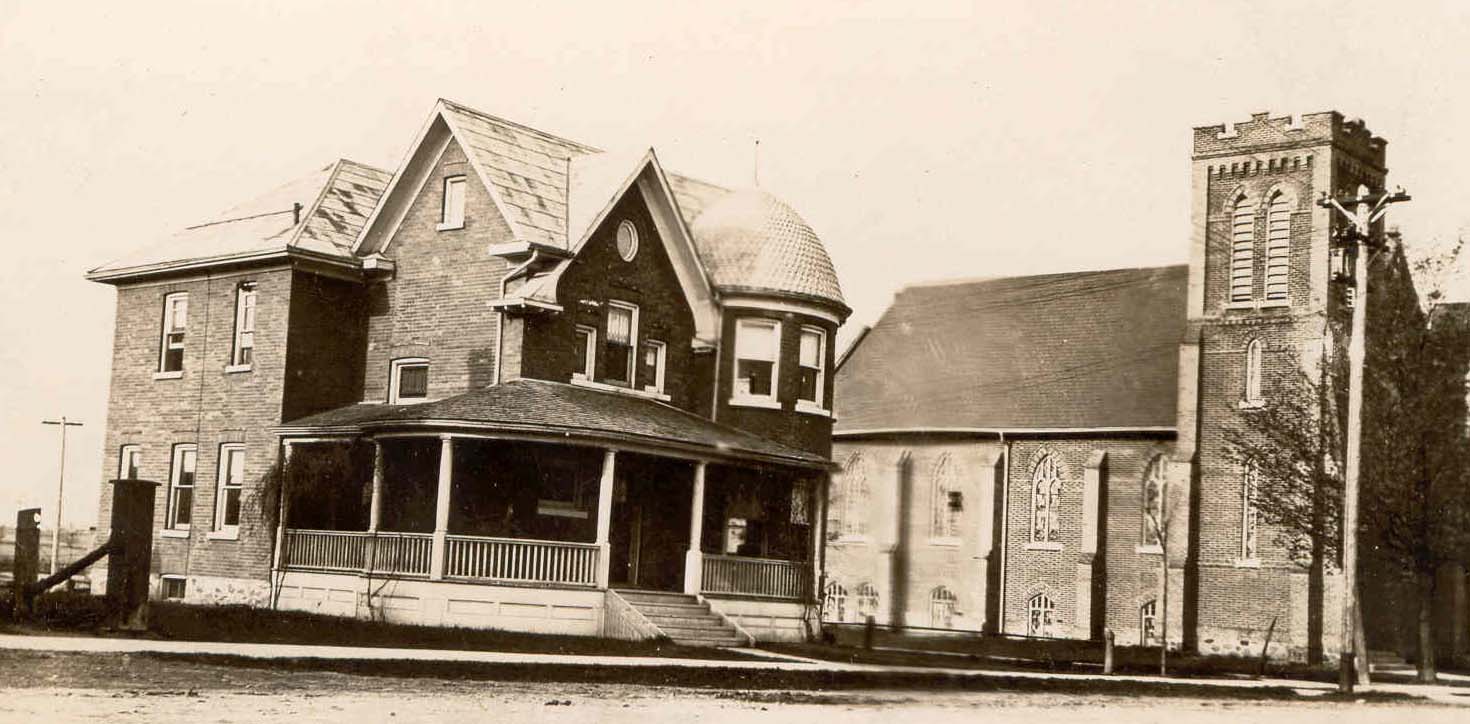 Photo of the exterior of the Cookstown Parsonage or manse, a clergy house inhabited by the local minister of the Methodist (later United) church located next door, which can be seen to the right of the house in the photo.. The building itself boasts distinctive architecture with a rounded front right side of the house capped with a unique rounded roof while the rest of the building has a regular open gable roof and surrounding verandah with white window trims and eaves. As of 2014 the building remains largely unchanged. The United Church boasts a square tower and pointed arch windows.