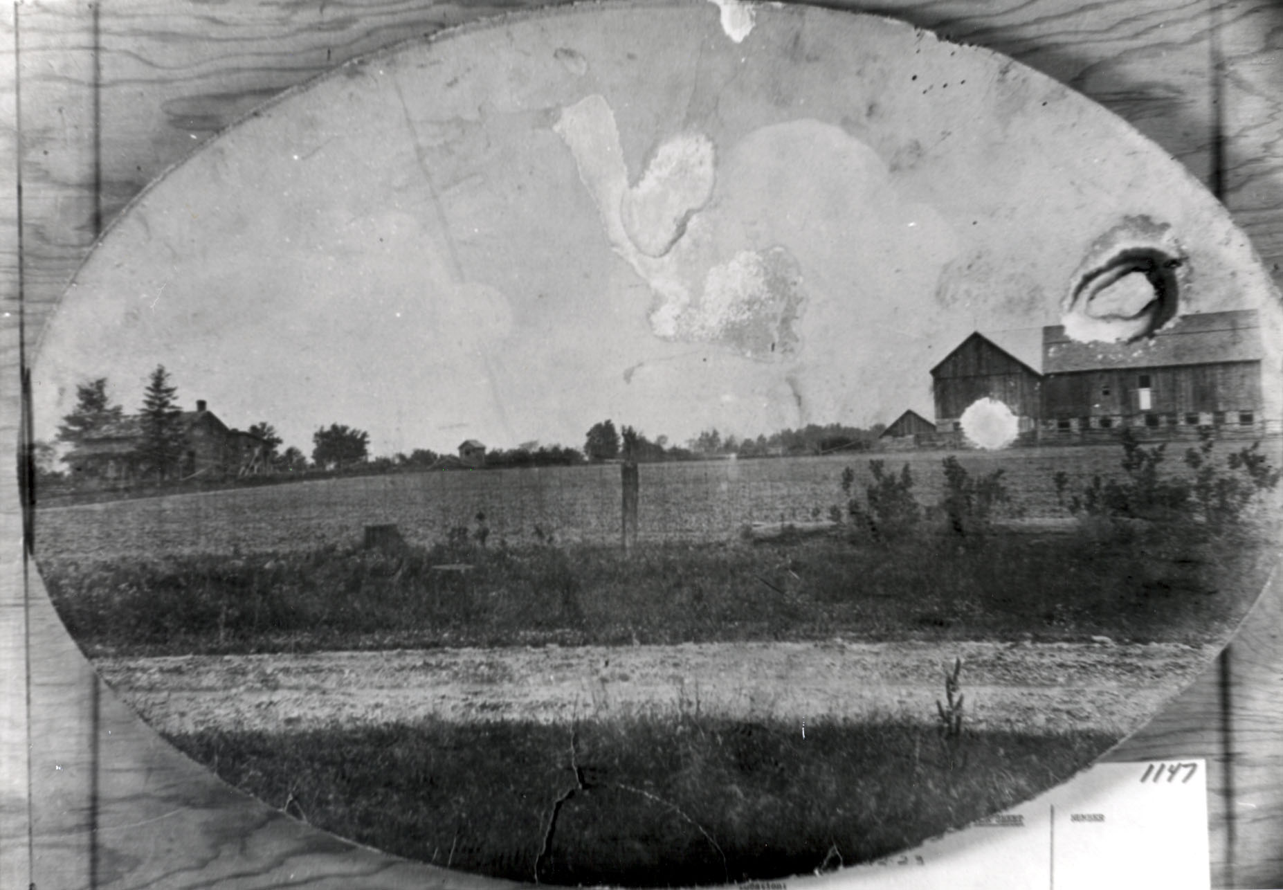 Picture of Mr. and Mrs. Edgar and May Thompson's farm, facing the 8th Conc., Highway 11 NW. The farm later belonged to Harry Eisses. Edgar Thompson's father bought the property in 1904 from Lou McConkey, and Edgar Thompson's father built an "L" shaped barn and shed in 1921. The house at that time was 125 years old. Edgar Thompson bought the property in 1933 after his mother's death, and remodeled the house with his wife in 1949-50. Hydro electricity was brought to the house in 1948. The taxes collected on the property in 1910 were $27.90 for the entire 100 acres, and $339.54 in 1964.
