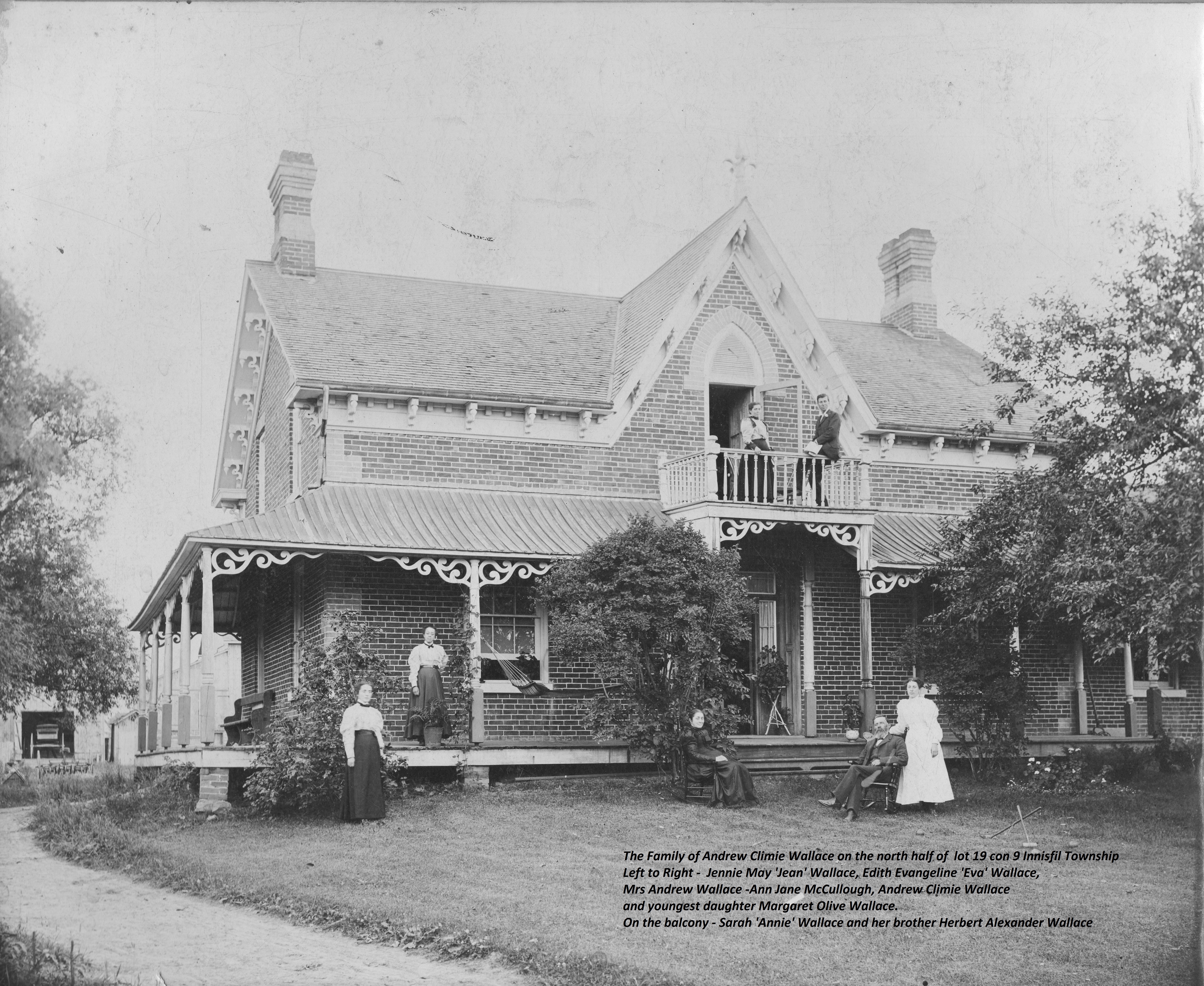 Photograph of the Wallace family in front of their homestead. Pictured on the balcony (left) is Sarah "Annie" Wallace, and her brother Herbert Wallace beside her. Left to right on the ground level is Jennie May "Jean" Wallace (later married to Dr. F.C. Bowman) followed by Edith Evangeline "Eva" Wallace (later married to Charles Dearing). Seated in the chairs are Mrs. Ann Jane Wallace (née McCullough) and Mr. Andrew Climie Wallace. The young woman standing beside Andrew Wallace is youngest daughter Olive Wallace (later married to William Boake and mother of Mrs. Jean Black).