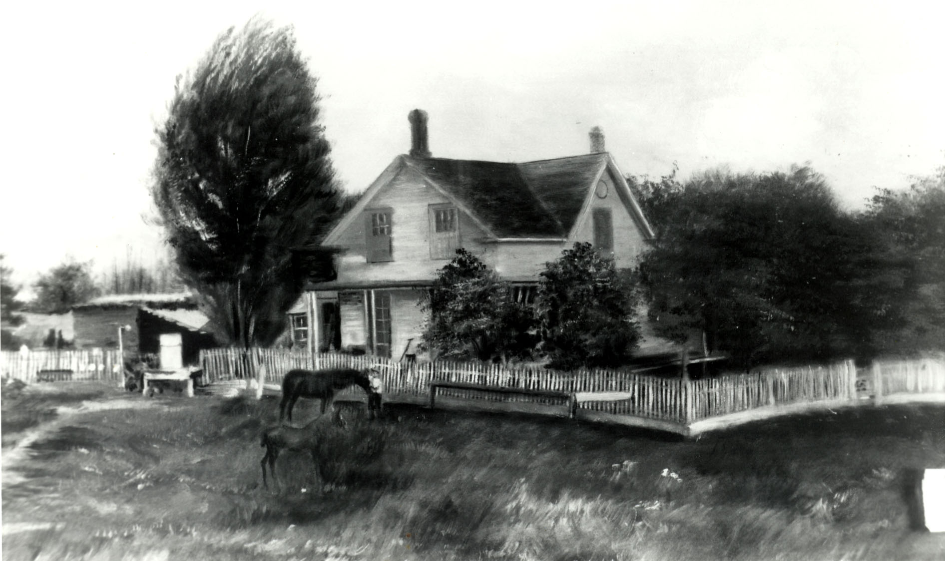 Painting of the house built by James Scott (he was uncle to Scott Sharp). It later became the Papp farm. The property originally belonged to James' father, Mitchell, who emigrated from Scotland. Mitchell died shortly after losing his leg in a farming accident. Mitchell was Scott Sharp's maternal grandfather.