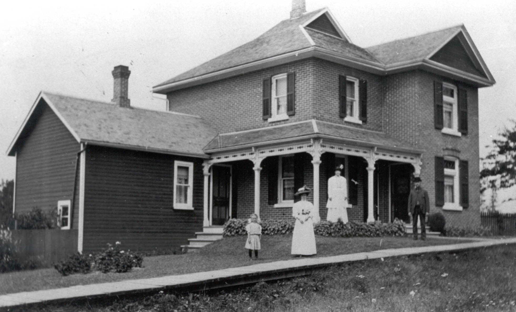 Photograph of the home of Mr. and Mrs. William T. and Dinah Miners from 1908 to 1911, located at 12 Church Street. The lot was originally owned by the Ferguson family from 1869 (when it was valued at $11.39) until 1908 when the Miners purchased it for $300. In 1911 the Miners sold the home to William R. Chantler for $2,000. Pictured standing in front of the home from left to right are Marion Webb, Marion Lacke (both relatives from England), Dinah Miners (née Webb), and William T. Miners. The building itself is red brick with dark decorative shutters around each window and a small roofed porch wrapping around the front left corner of the house. The roof is a combination of Dutch and box gable, and a plank sidewalk is also visible along the front of the yard.