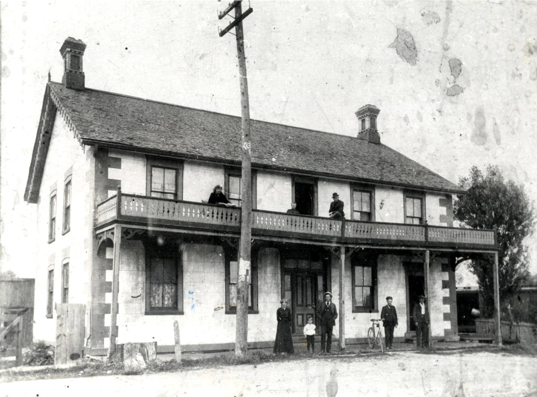 Photo of the boarding house in Allandale owned by Mary Page (née Gregg). Pictured on the balcony is Mary Page (left), and on ground level from left to right are Ethel Page (daughter of Mary), Jack Page Jr., and Jack Page Sr. The others are unidentified.