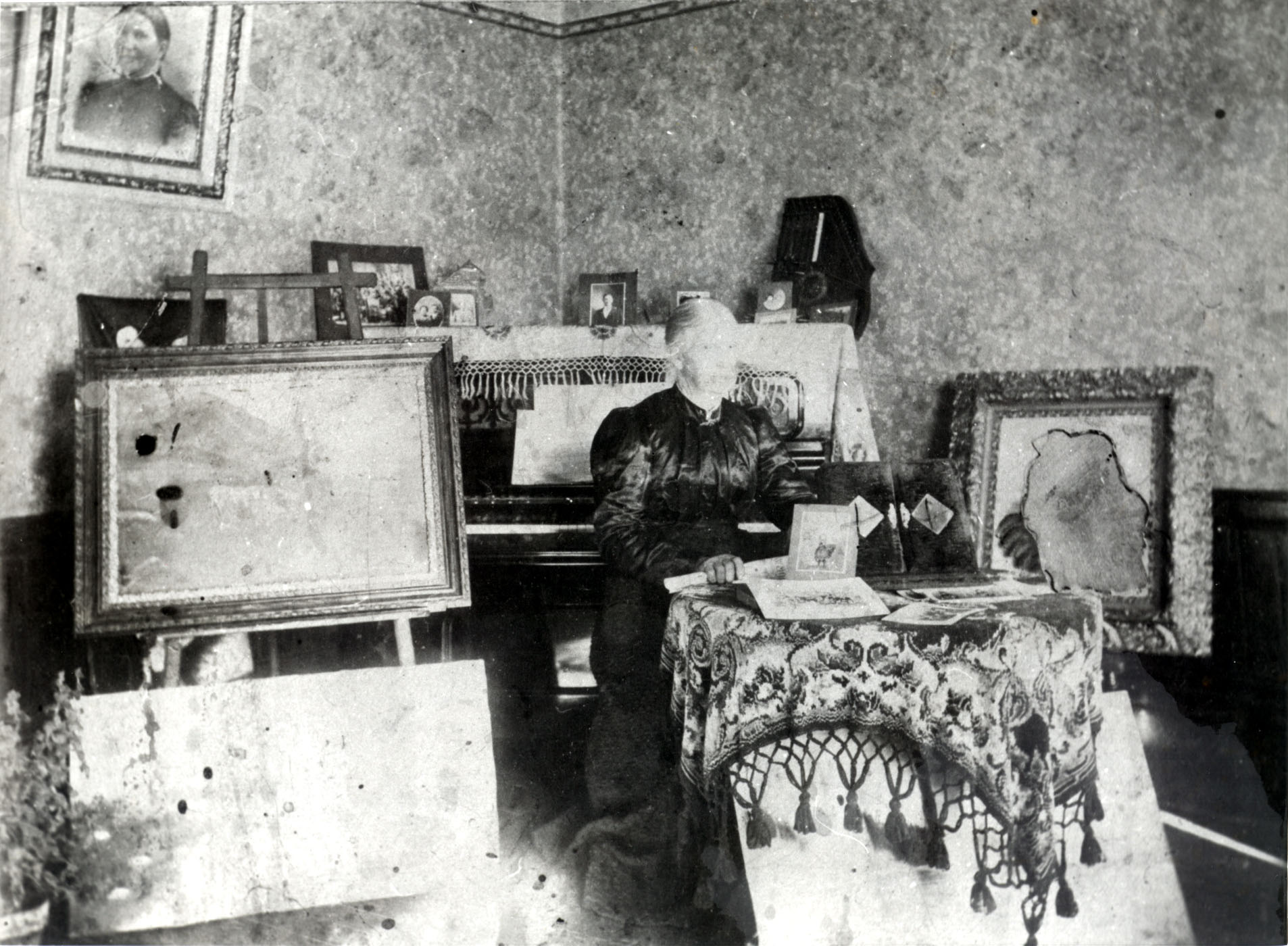Photo of Elizabeth Courtney Gregg sitting in front of the piano inside the Allandale boarding house. Taken in 1905, the image shows Elizabeth wearing period clothing. The room hosts photographs, paintings, an easel, piano, and small table.