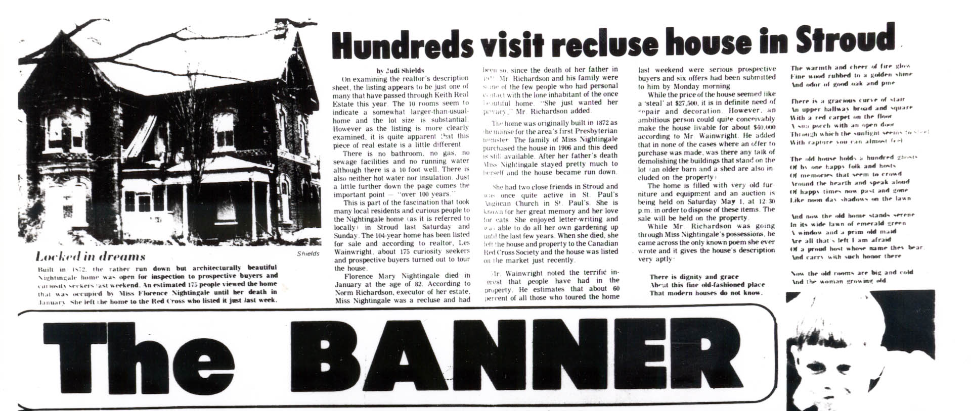 Photocopy of a newspaper article from The Banner describing the sale of a house in Stroud known as the Nightingale home. The article details how the building was originally constructed in 1872 and served as the manse for the Presbyterian minister, but was later purchased by Mr. and Mrs. William Nightingale. Their daughter Florence lived in the home until her death at age 82. The property was willed to the Canadian Red Cross Society and later put on sale for a price of $27 000 (date of sale unknown). The home at the time of sale had no running water or sewage facilities, no gas, and no insulation.