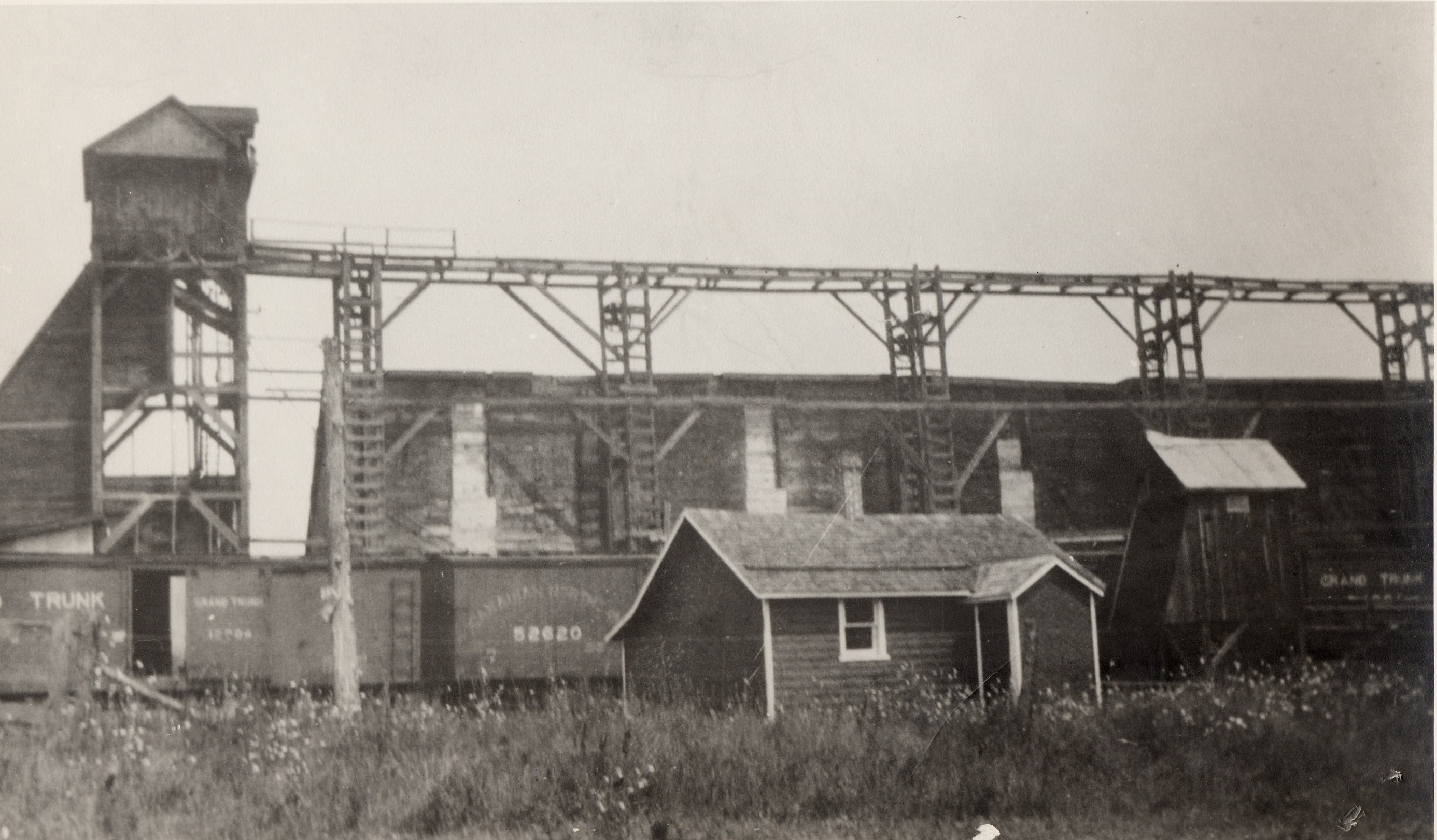 Photo of the Belle Ewart Ice Company's ice house, with rail cars from the Grand Trunk and Canadian Northern rail lines visible along the load platform.