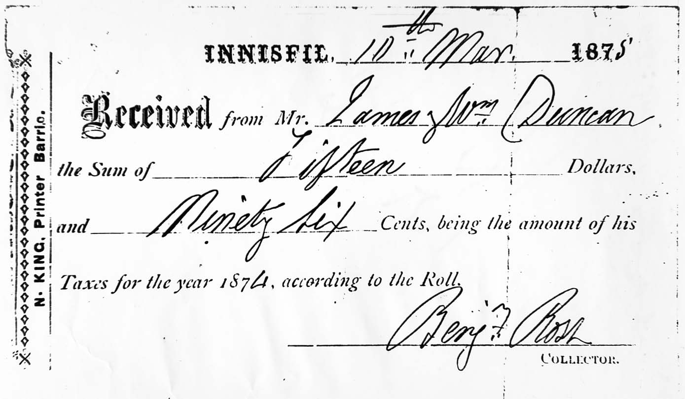 Tax receipt from 1874 issued to James William Duncan for the 1874 tax year in the amount of $15.96.