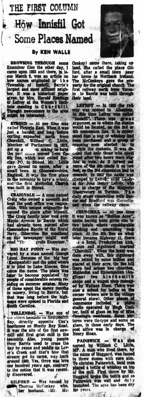 Copy of a newspaper article from c. 1950 entitled "How Innisfil Got Some Places Named" by Ken Walls. The article includes explanations of the names for Stroud, Craigvale, Big Bay Point, Tollendal, Gilford, Lefroy, Churchill, and Painswick.