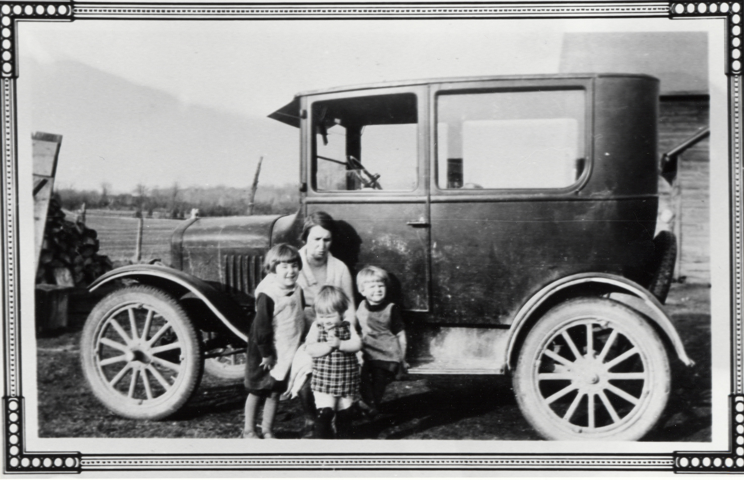 Beatrice Miller (née Irving) with her children Audrey, Lois, and Gladys Miller. They are crouched in front of a 1930s style automobile, which is parked on a farm. There is a decorative border around the photo.