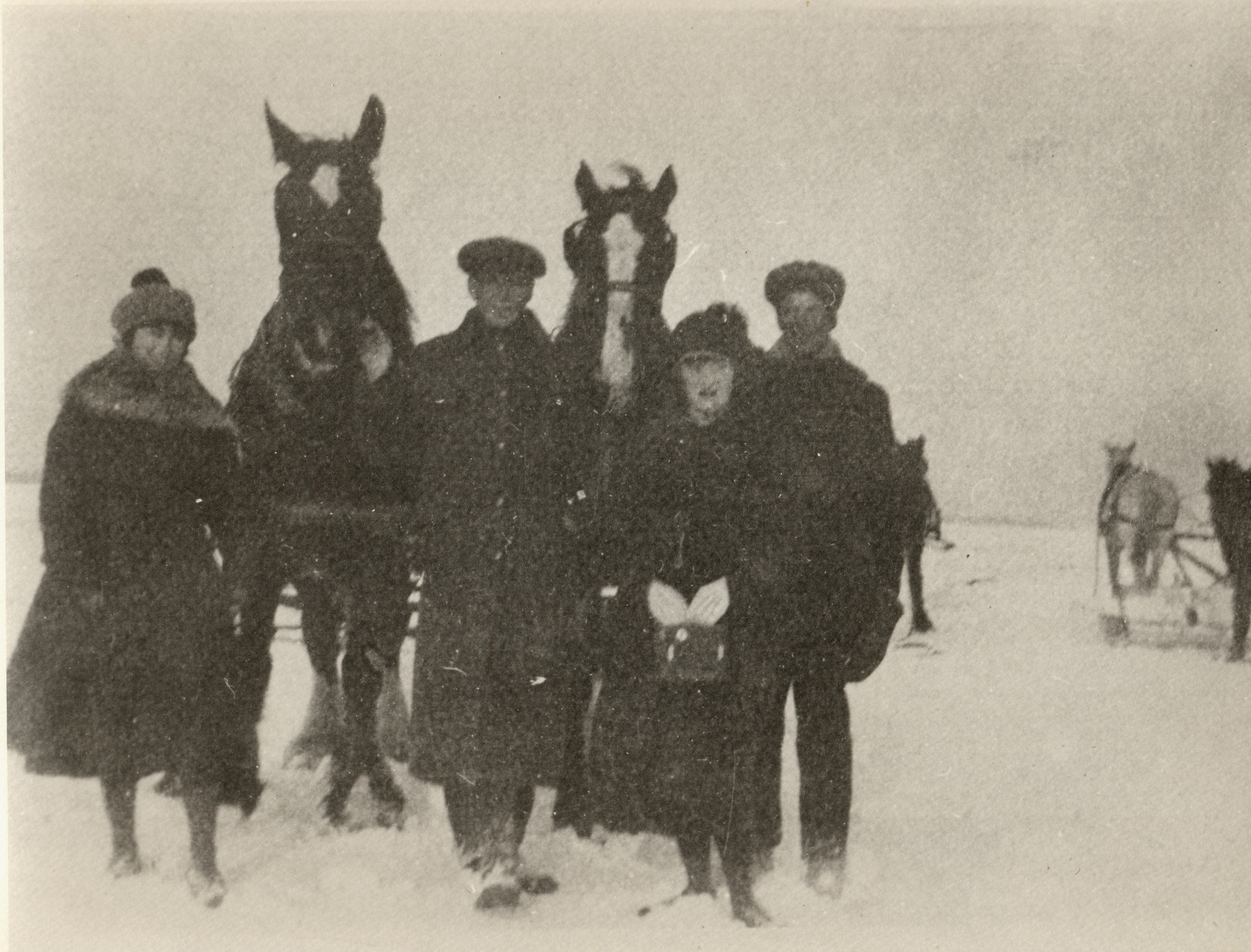 Two men and two women in long winter coats and hats stand in front of a team of two large horses in the snow. Visible in the background is a second team of horses scraping snow off the ice in order to begin ice cutting for the Lake Simcoe Ice Company.