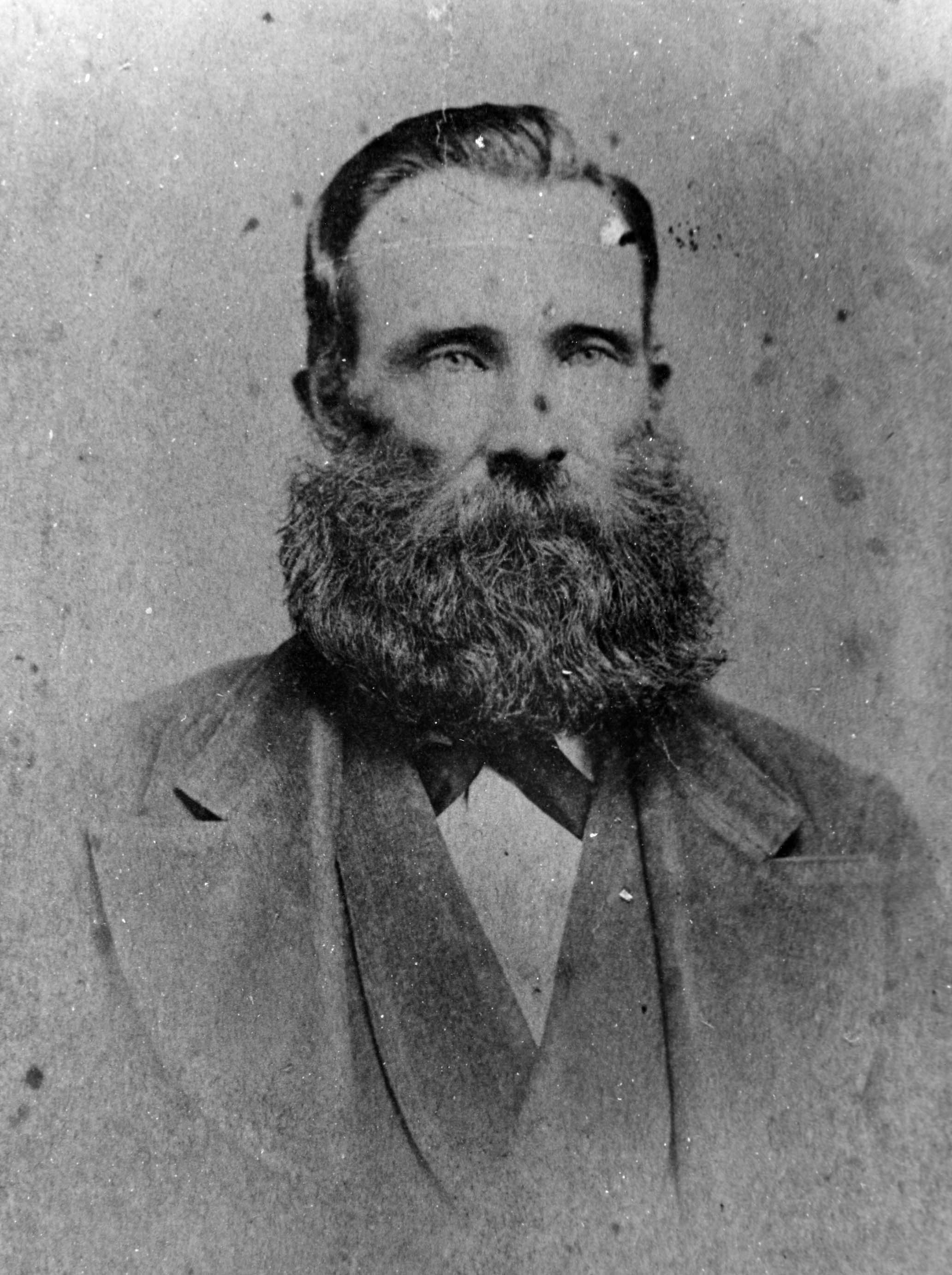 Portrait of William Hubbert (1829-1896), the father of the Hubbert Family. The photo only shows his face and shoulders, and he is wearing a beard and coat. He was married to Ann Teasdale and together they had six sons and three daughters: William (1851-1929, m. Elizabeth Stephenson), John (1852-1930, m. Emma Herrell), Charles (1856-1870, James (1858-1945, m. Martha Srigley), Rebecca (1860-1924, m. William Hopkins), Jonathan (1863-1931, m. Jame Pearson), Thursa (1871-1945, m. Thomas Bishop, later m. Grant Jarvis), and Rhoda (m. William Pearson). Of these, all but two established homes in Innisfil Township. The old homestead remained in the family name until the retirement of W.O. Hubbert in 1944.