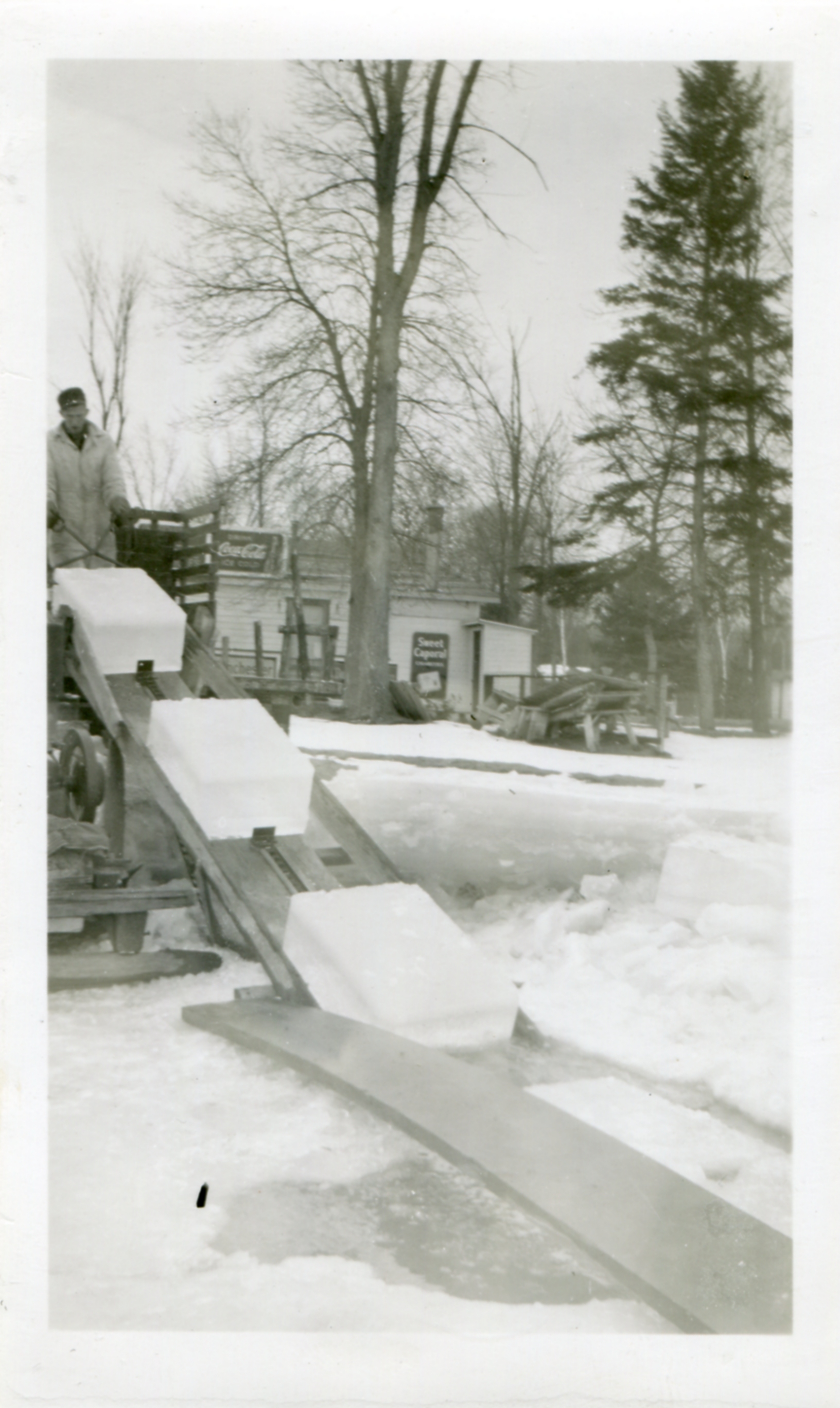 Photo of blocks of ice on an elevated conveyor belt with a man, John Ferguson, standing at the top of the elevator. The ice was stored by the Belle Ewart Ice Company and was used locally for cooling and refrigeration. The photo was taken on 5 March 1949 towards the end of the ice industry's heyday.