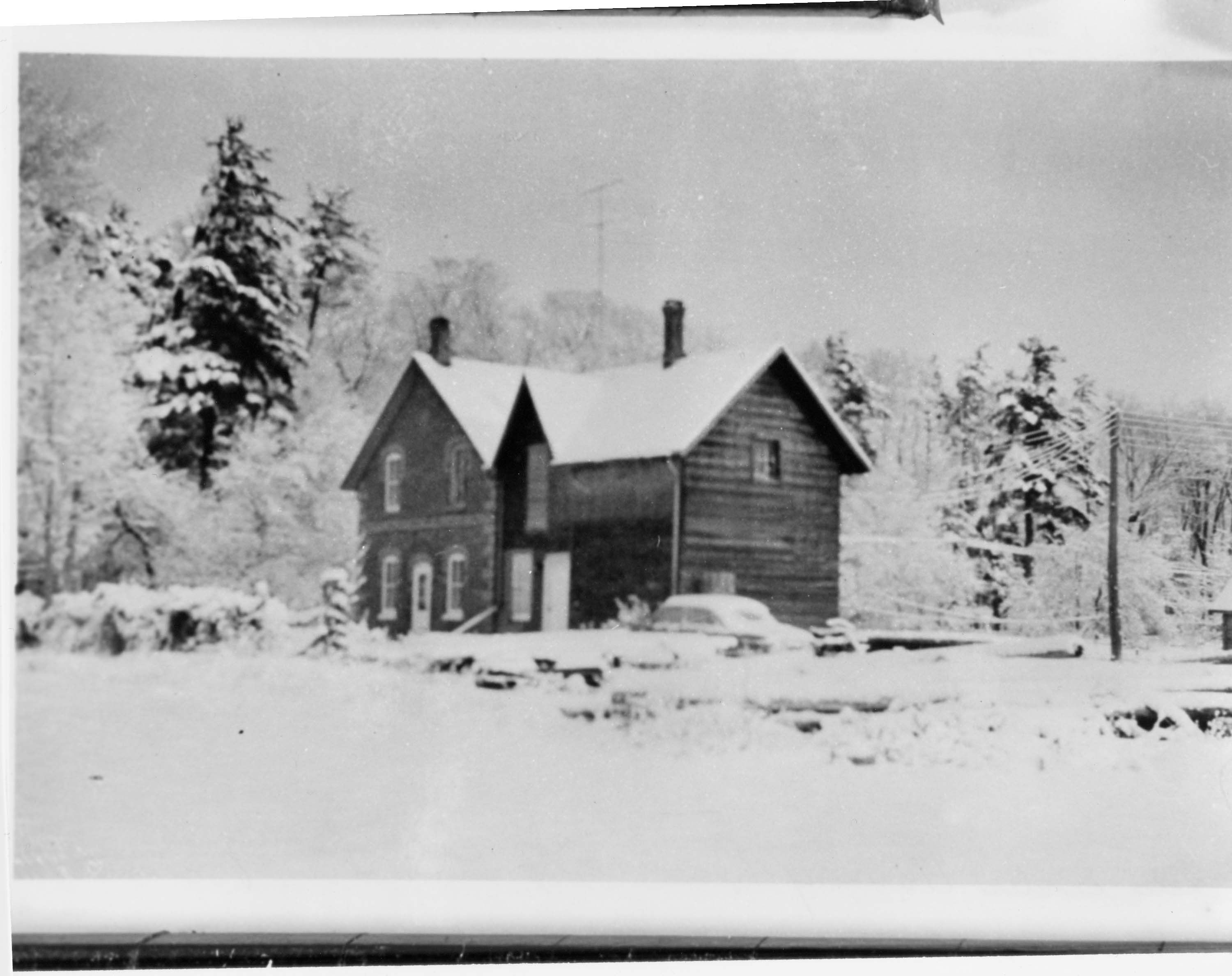 Photo taken from the southwest view of the Carr Homestead, a small house composed of dichromatic brick. The roof, yard, and surrounding trees are snow covered.