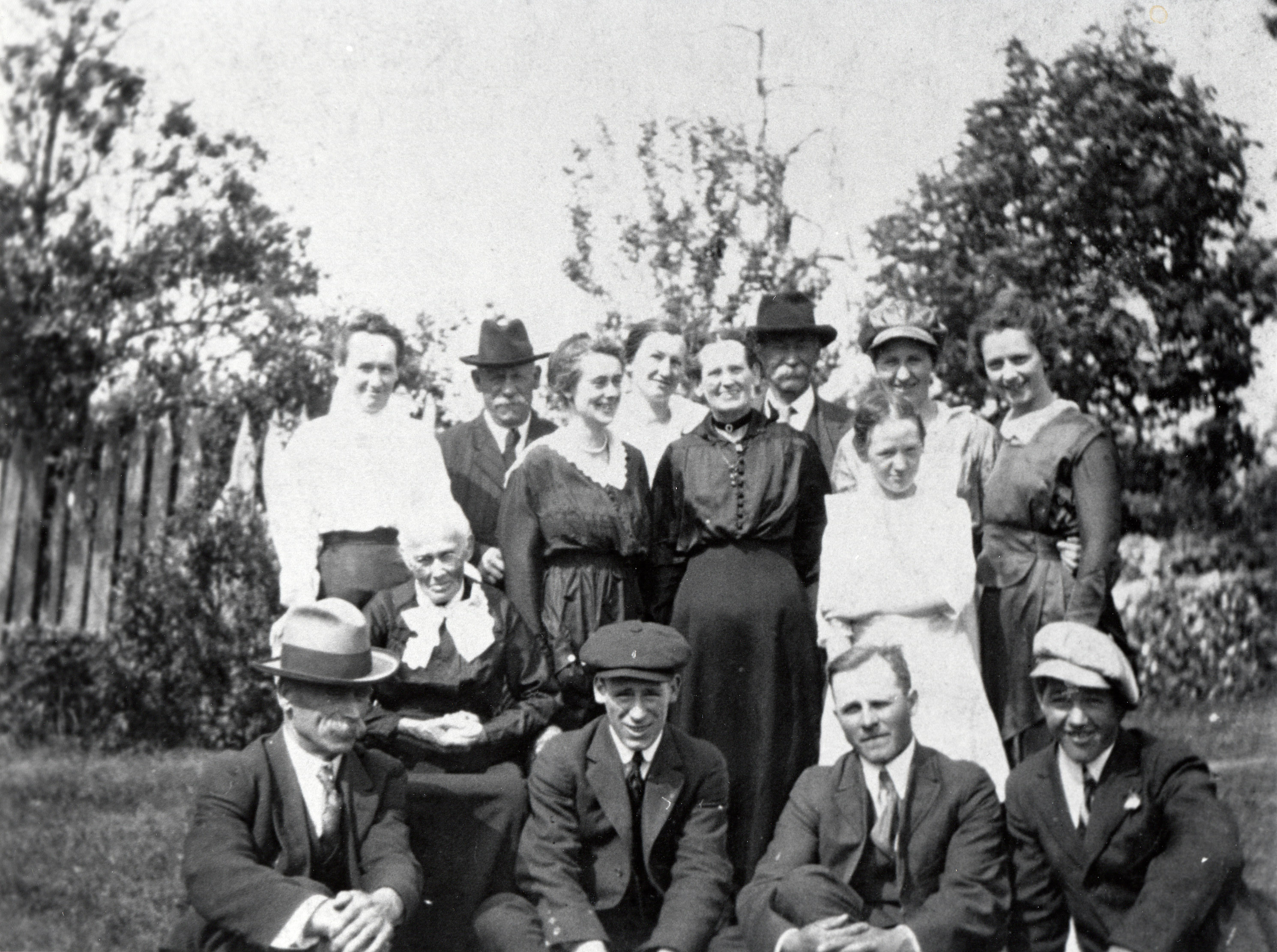 Photo of a number of members of the Irving family gathered outdoors. The men are wearing suits and hats, and the women are in dresses. Pictured from left to right - Standing: Sarah Irving, John Barnhardt, Dorothy Barnhardt, Beatrice Irving, Maggie Barnhardt, Thomas Irving, Cristina Irving (in white), Mabel Cooper, and Clara Irving. Seated are: George Luck, Cristina Luck, Edward Barnhardt, Clarence Cooper, and Harry Irving.