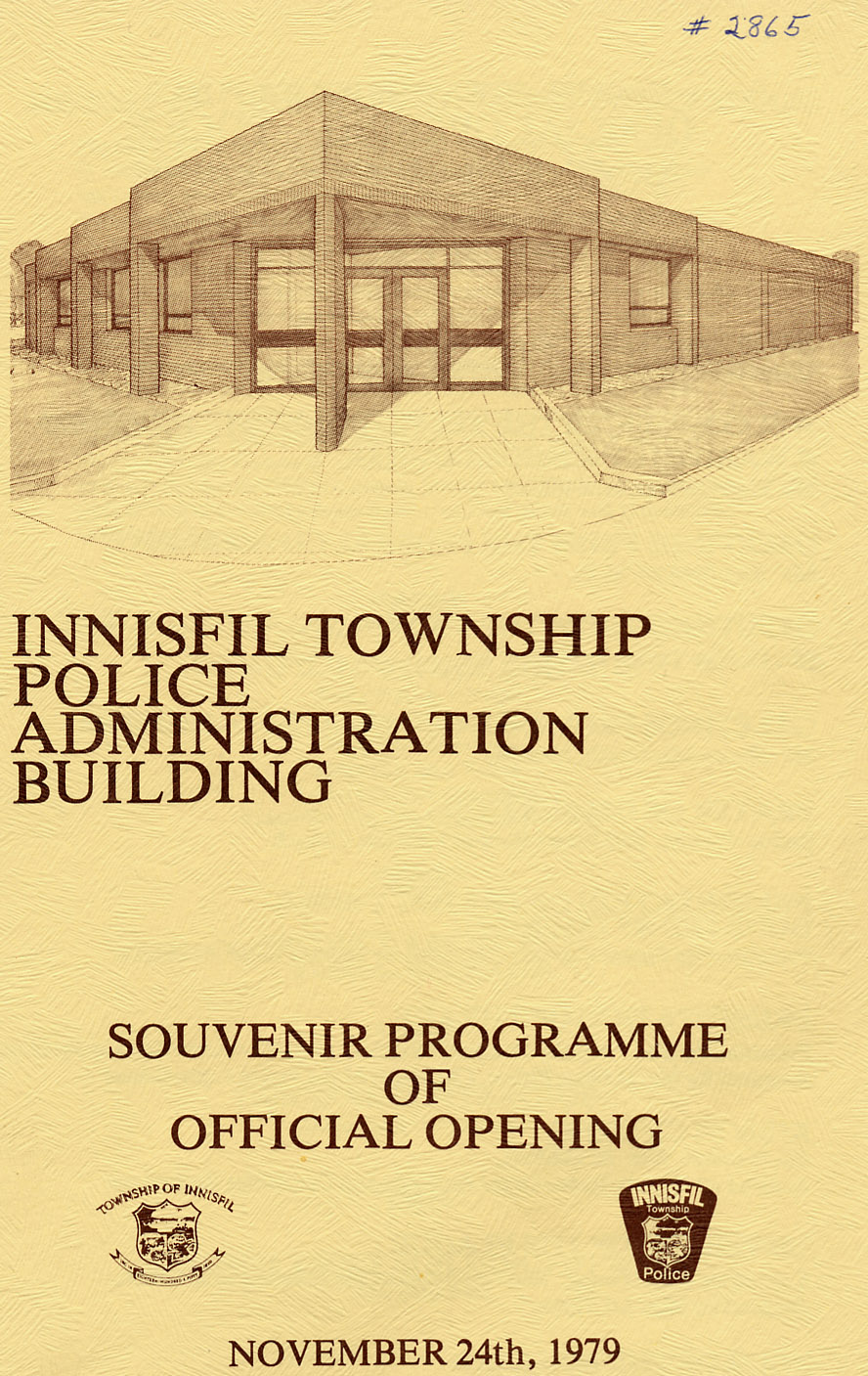 Copy of the souvenir programme of the official opening of the Innisfil Township Police Administration Building on 24 November 1979. The cover itself depicts a sketch of the building and was printed on yellow paper. The programme contains a brief history of the police force in the area as well as a list of members current at the time.
