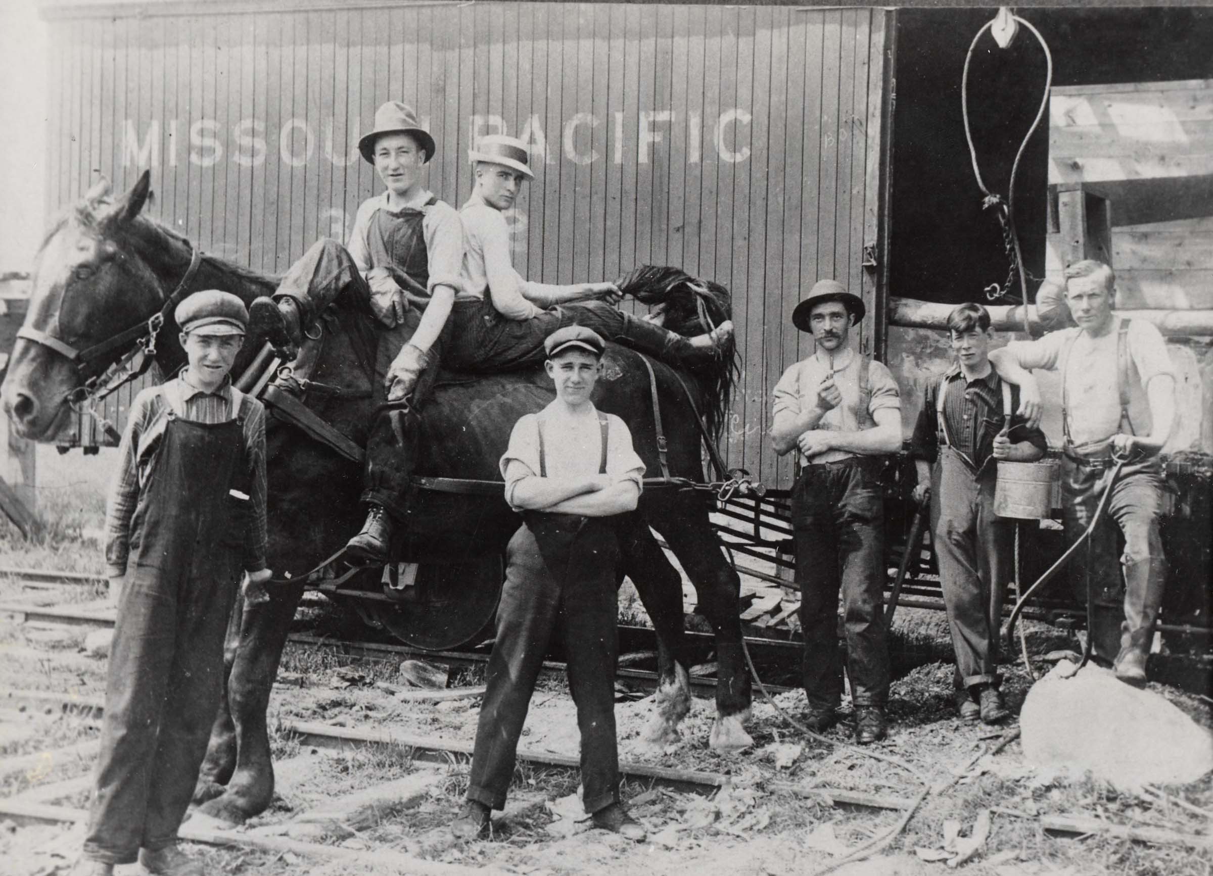 Sybil Stansfield of Belle Ewart provided this photo of the ice house gang, taken in the mid-20th century to the Bradford Witness newspaper. The photo shows seven men, all dressed in overalls and hats, standing in front of a train car labelled Missouri Pacific. Two of the men are sitting back-to-back on a draft horse. In the photo are Bob Mullen on the far left with Clarence Dollar beside him. A young George Baxter is the fourth man on the left, and Jack Hardy is one of the men seated on the horse. The ice industry flourished on Lake Simcoe in the early to mid twentieth century, employing a number of men in both the winter and summer. Belle Ewart ice houses supplied much of southern Ontario with ice, but with the advent of electric refrigerators the industry gradually died out.