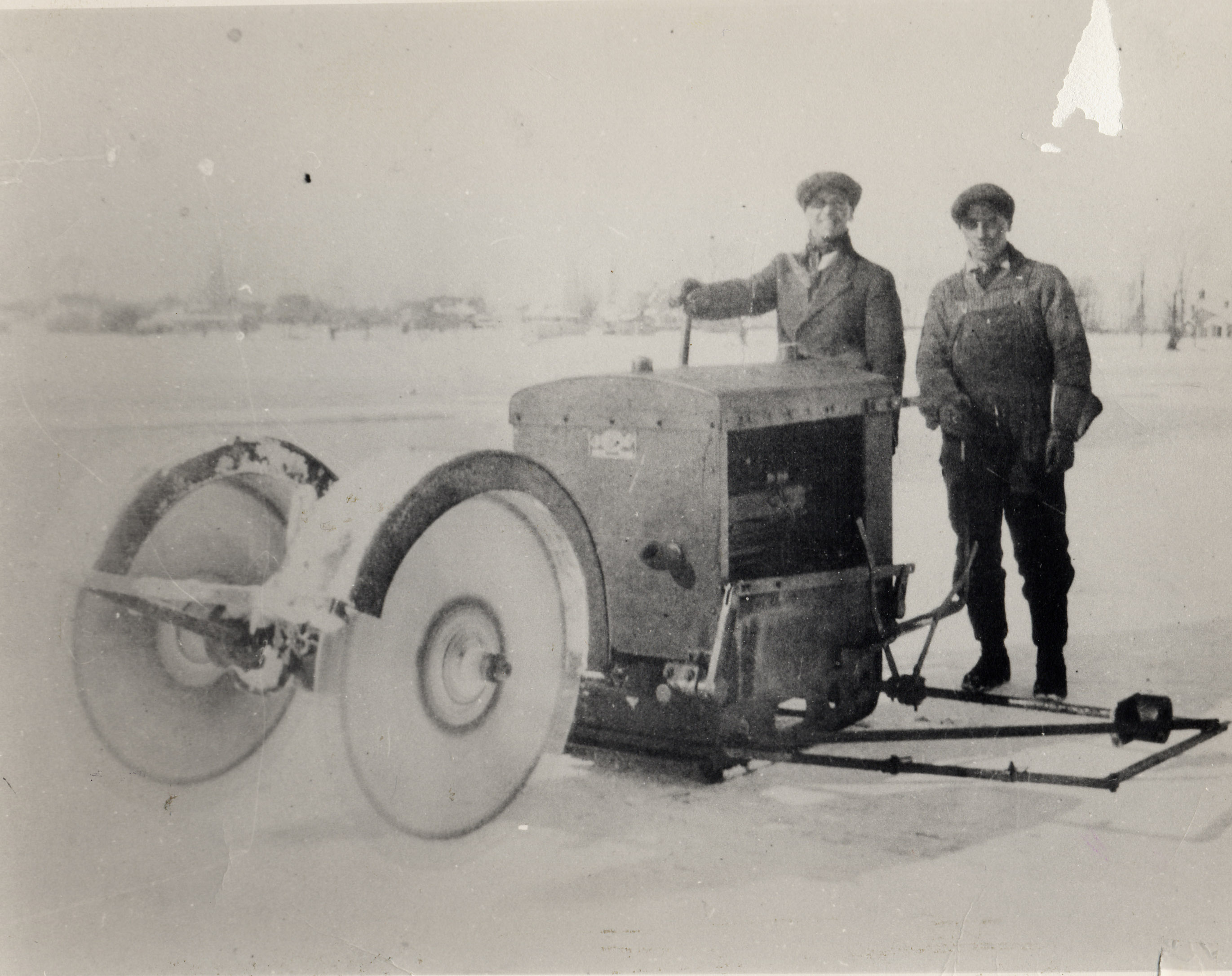 Photo of Calvin Boyd and Fred Quantz cutting ice with a large motorized double-bladed saw for the Lake Simcoe Ice Company at Belle Ewart. Both men are wearing gloves, hats, and overalls.