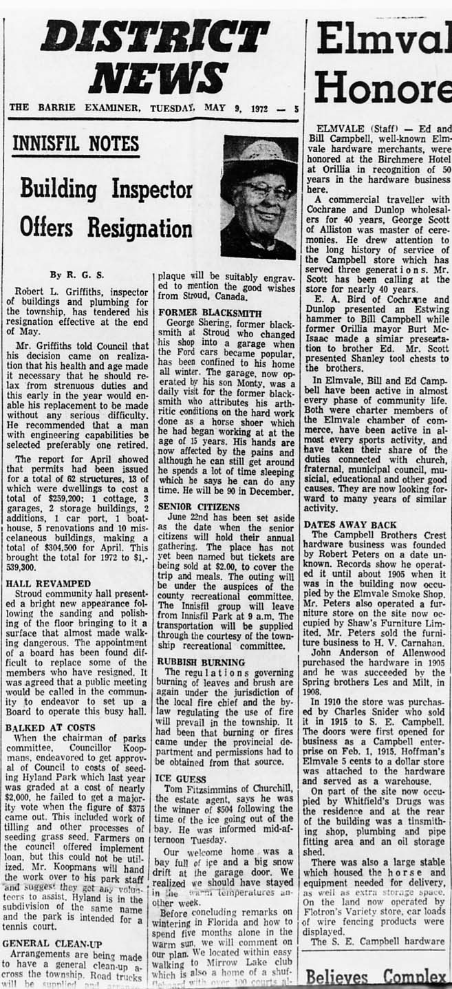 Newspaper clipping from The Barrie Examiner. "Innisfil Notes" by R.G. Simpkin. "Building Inspector Offers Resignation". Page 1 of 2. Second page on file at Knock.