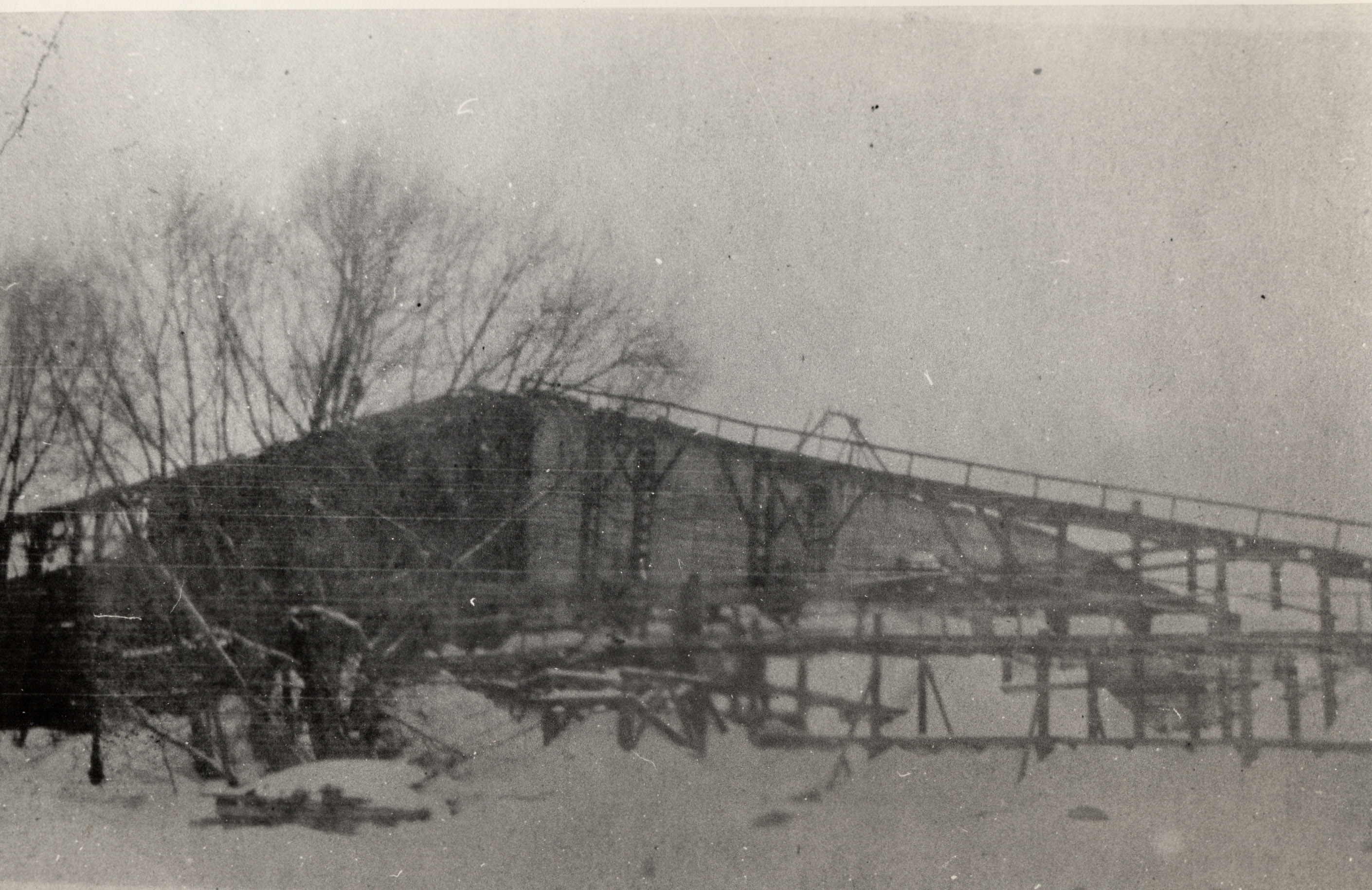 Photograph of the conveyors constructed to transport blocks of ice harvested from Lake Simcoe into a Belle Ewart Ice Company ice house on the shore. The conveyor structures and the building are all made of wood. Blocks of ice would be stored in the ice house year round and shipped as far as the United States to be used in home ice boxes.