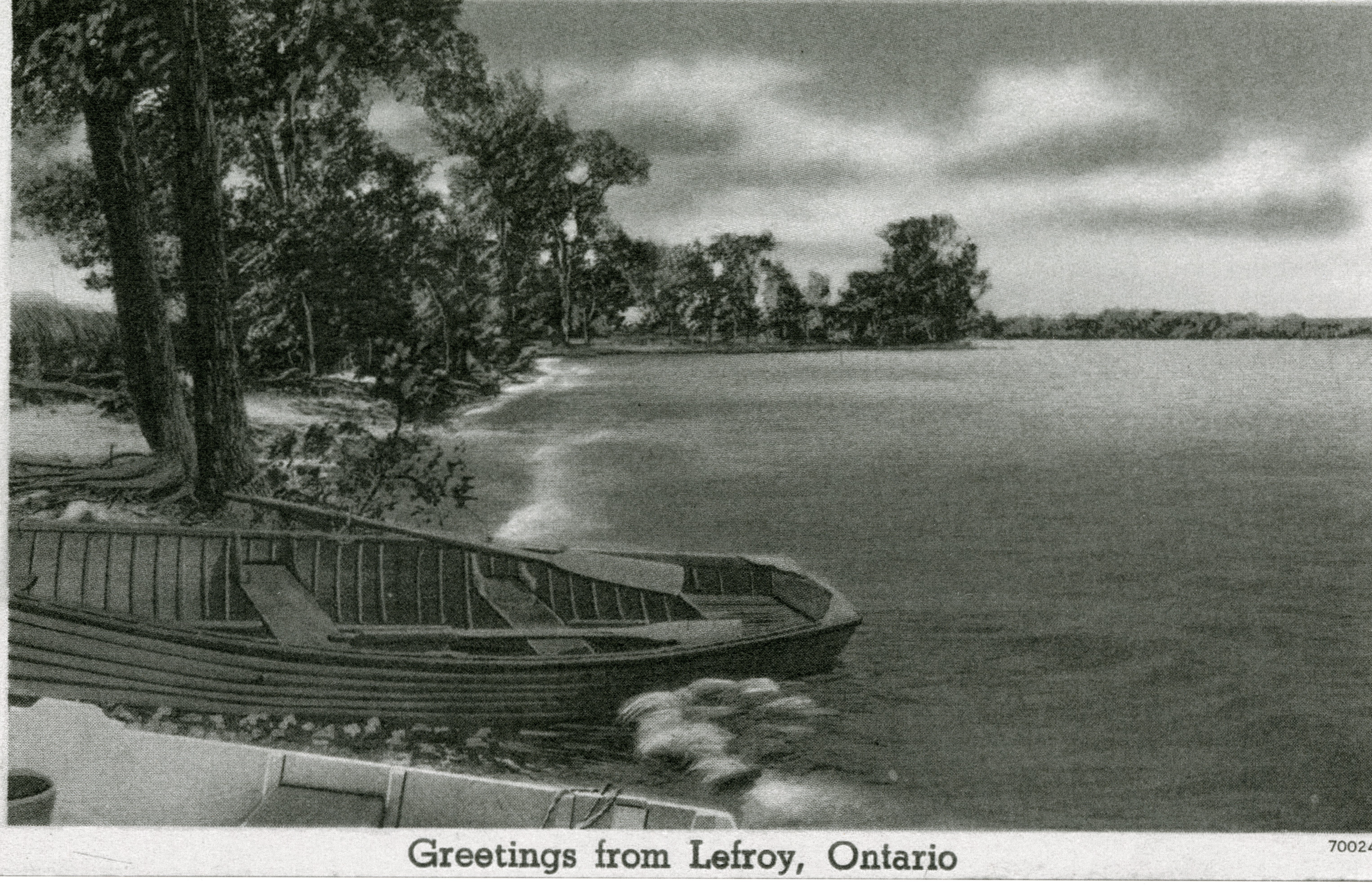 Black and white photograph of the shoreline at Beach Area at the 4th Line (Killarney Beach Area). In this picture, that may actually be a painting we can see boats on the shoreline and many trees on a cloudy day. This photo is likely a scan of a postcard and has a caption that reads, "Greetings from Lefroy, Ontario".