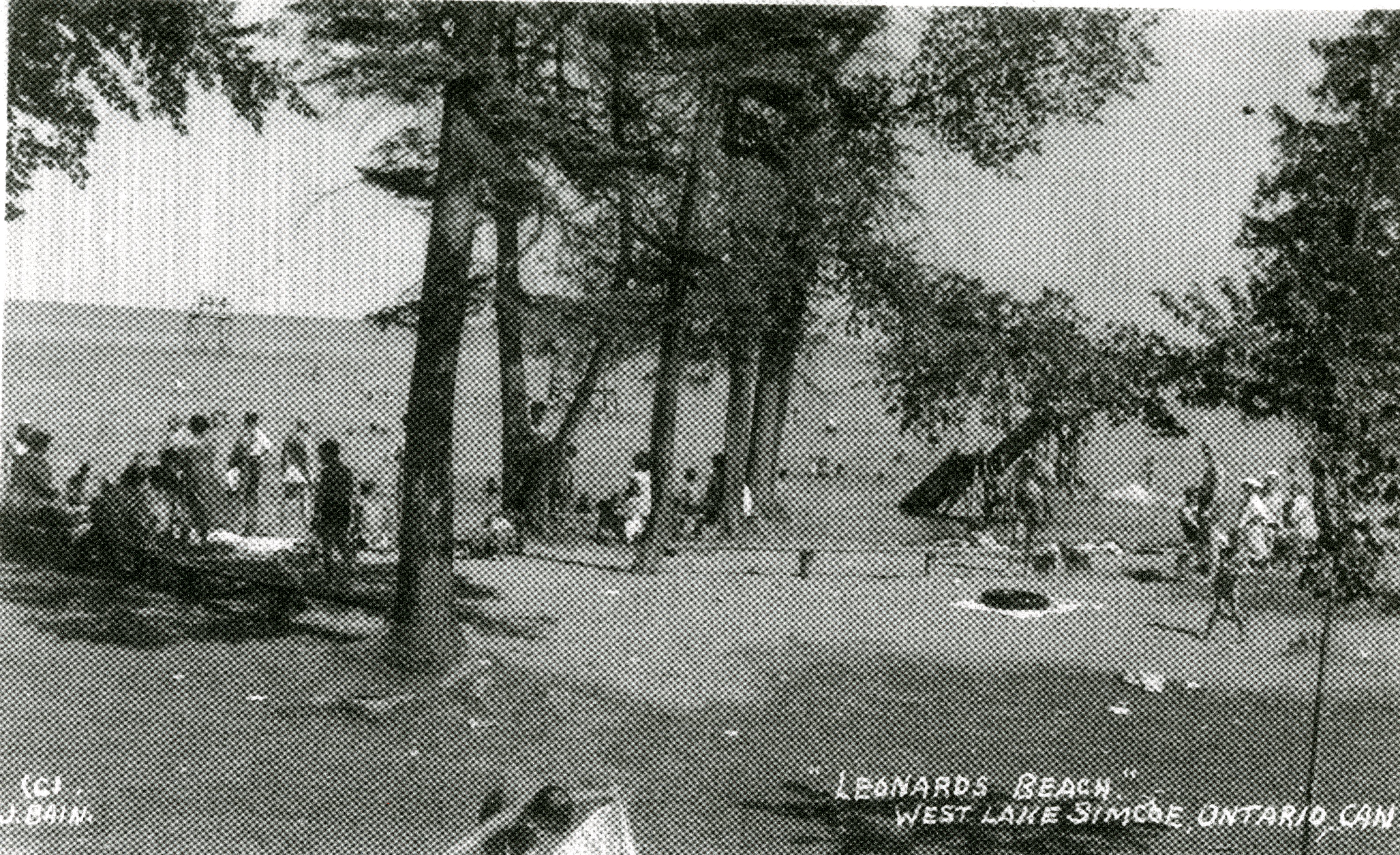Postcard photo of the crowds of people of all ages in swimsuits on Leonard's Beach, Lake Simcoe in the summer.