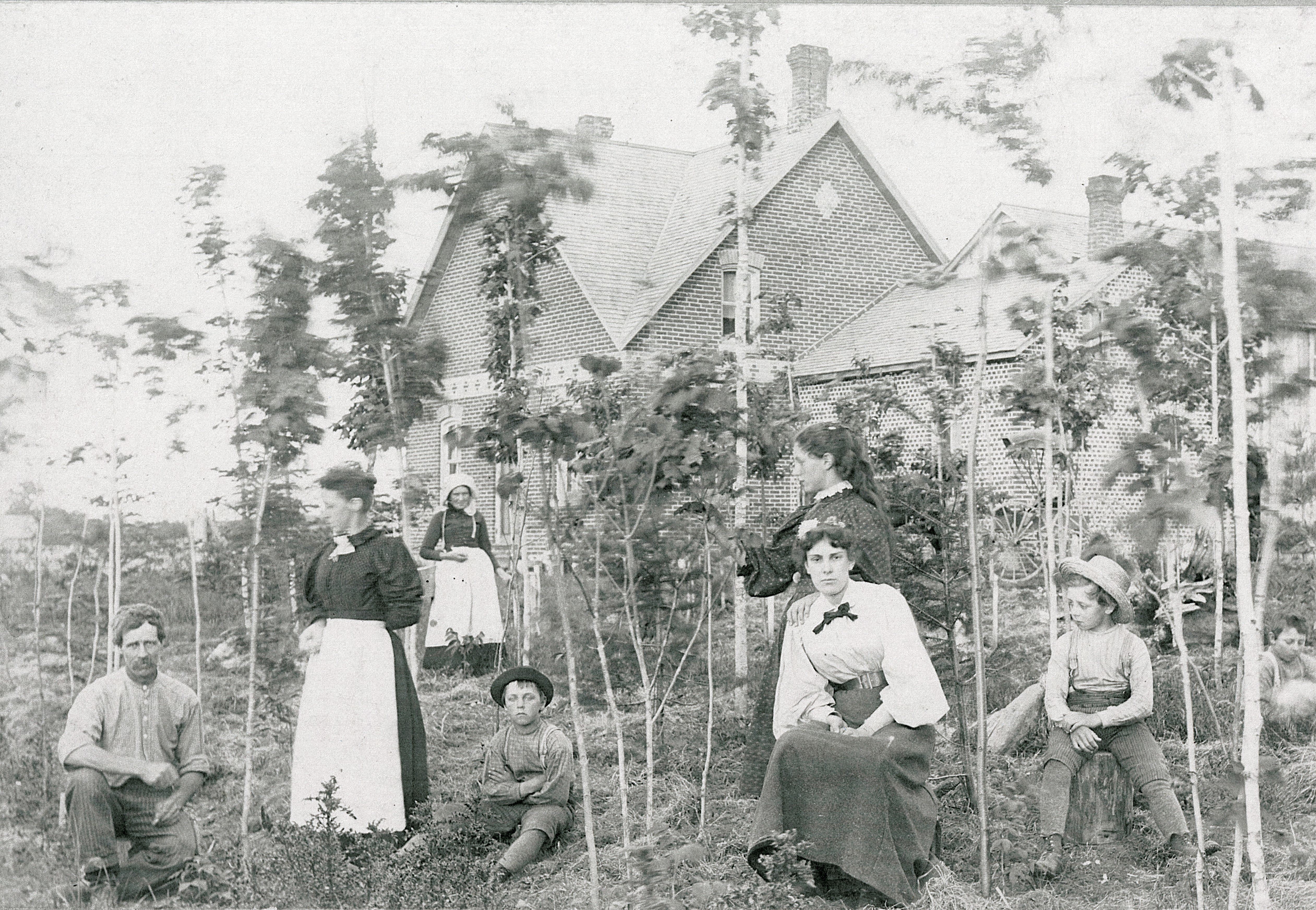 John Thompson and his three sons, Harry, Fred, Wilson, among maple trees (names of the women in the photograph are unknown)
