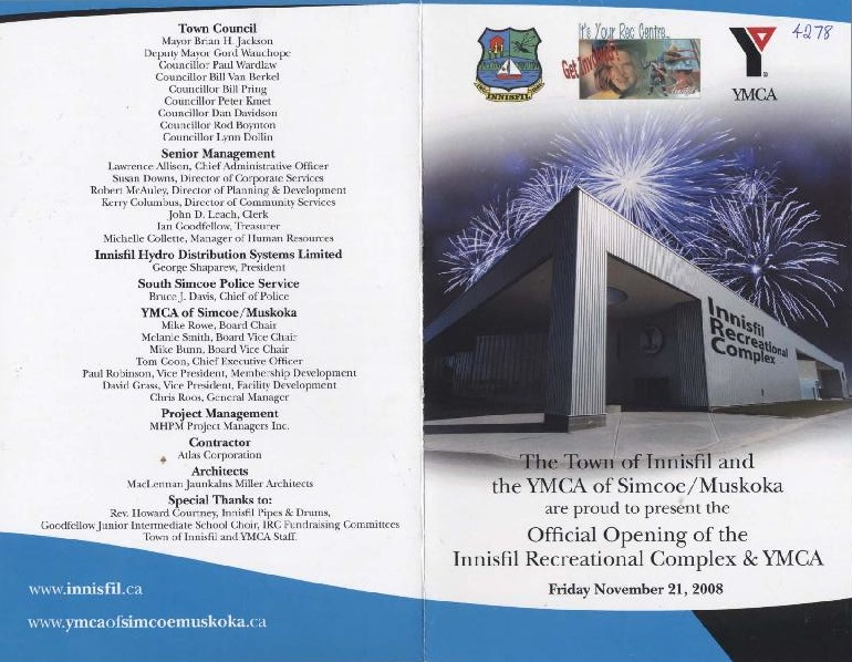 Scan of the programme of the Official Opening of Innisfil Recreation Complex and YMCA on 21 November 2008. The programme features a blue theme with a photo of the exterior of the recreational building surrounded by fireworks on the front. The back lists the Town council members, senior management, Innisfil Hydro Distributions Management, South Simcoe Police Service, YMCA of Simcoe/Muskoka, project management, contractor, architects, and special thanks.