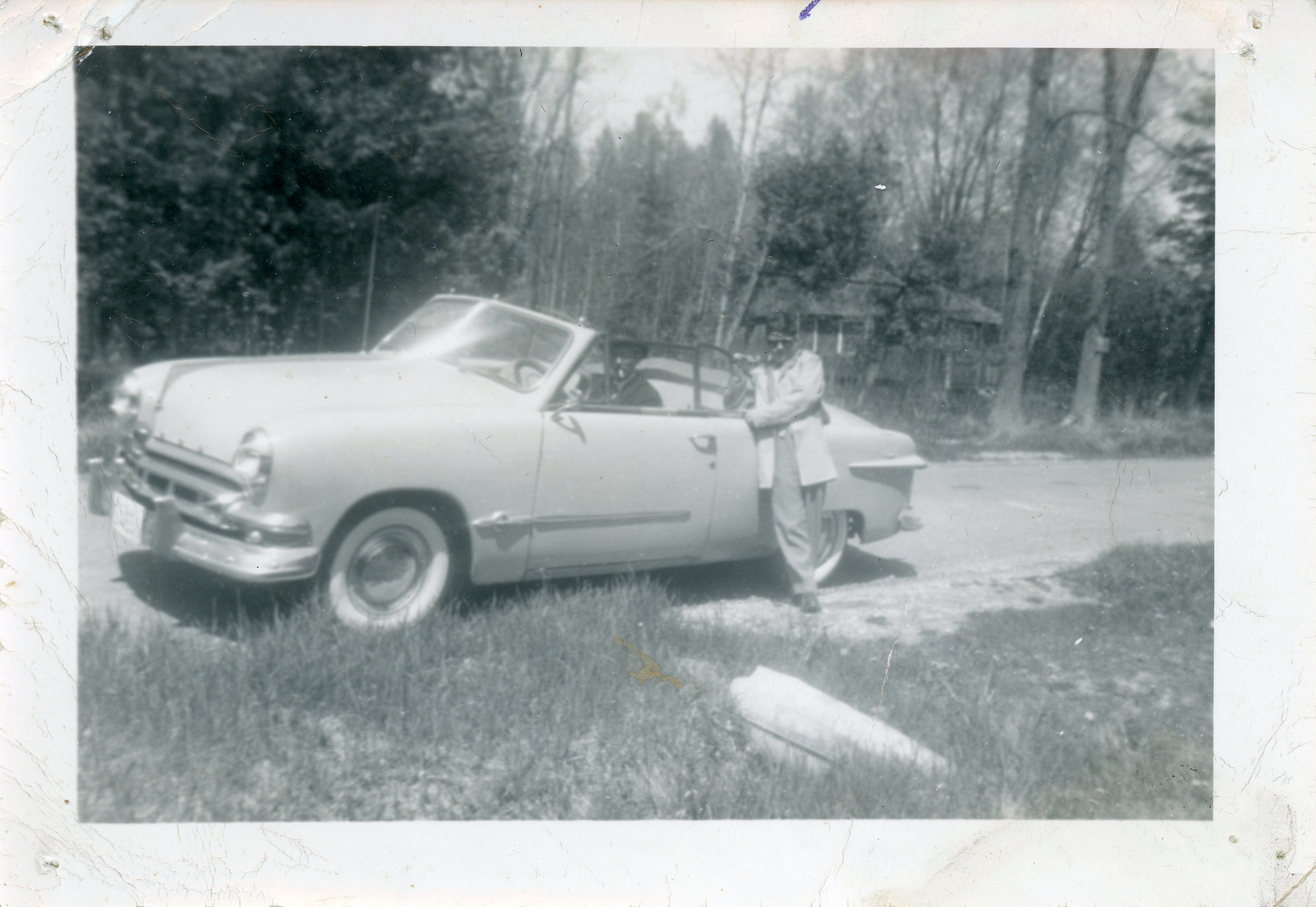 Black and white photo of a 1951 chartreuse Meteor convertible manufactured by Ford, Tom Murray at the wheel and son Wayne Murray leans against the car. This photo was taken in May of 1954 at Leonard's Beach.