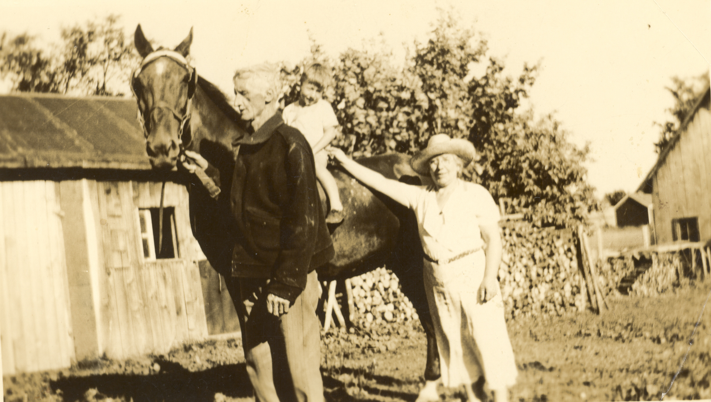 Photo of William Robert "Bob" Warnica (22 December 1865 - 22 September 1939) and his wife Jean (née Loudon, 28 August 1884 - 13 May 1964) leading their nephew, David McCracken, on a horse named Old Doc through a barnyard. Bob was the son of George Frederic Hanning Warnica, known as Hanning Warnica (1837-1915). David is the son of Jean's sister, Mary Loudon, and her husband Robert McCracken.