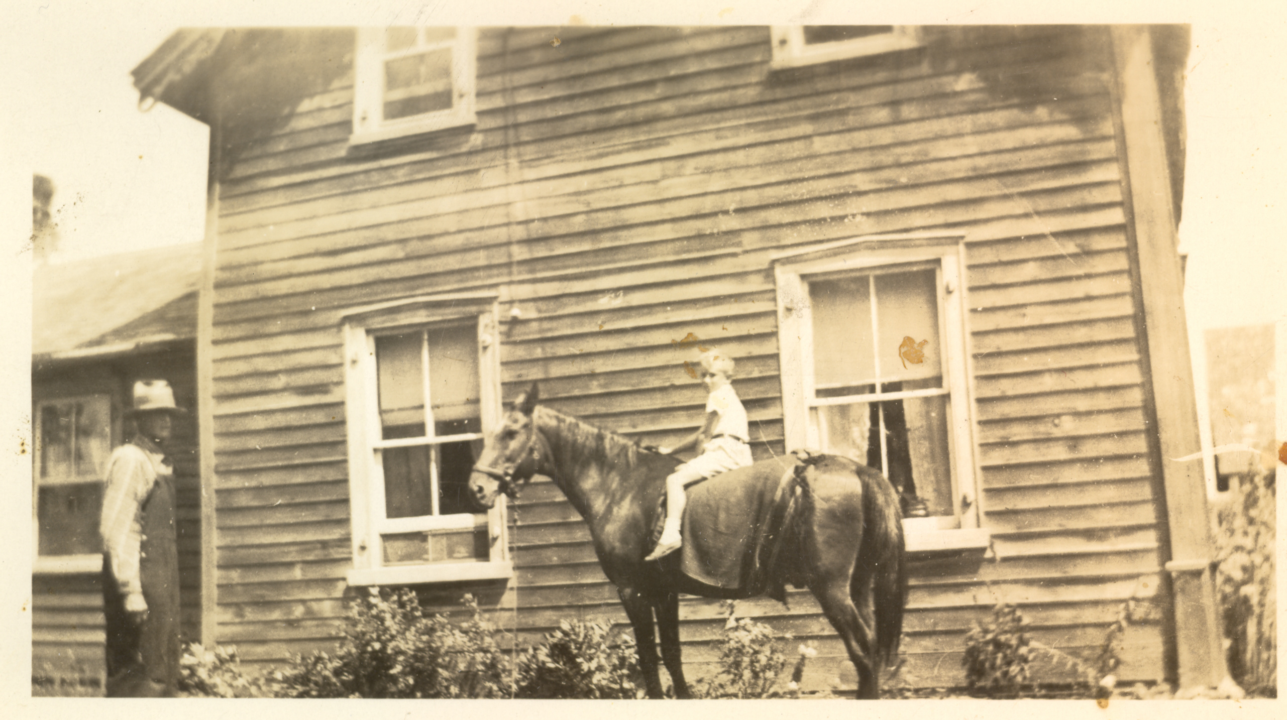 Photo of William Robert "Bob" Warnica (22 December 1865 - 22 September 1939) leading his nephew, David McCracken, on a horse named Old Doc tin front of his home in Painswick. Bob was the son of George Frederic Hanning Warnica, known as Hanning Warnica (1837-1915). David is the son of Mary Loudon (sister of Bob's wife, Jean) and her husband Robert McCracken.