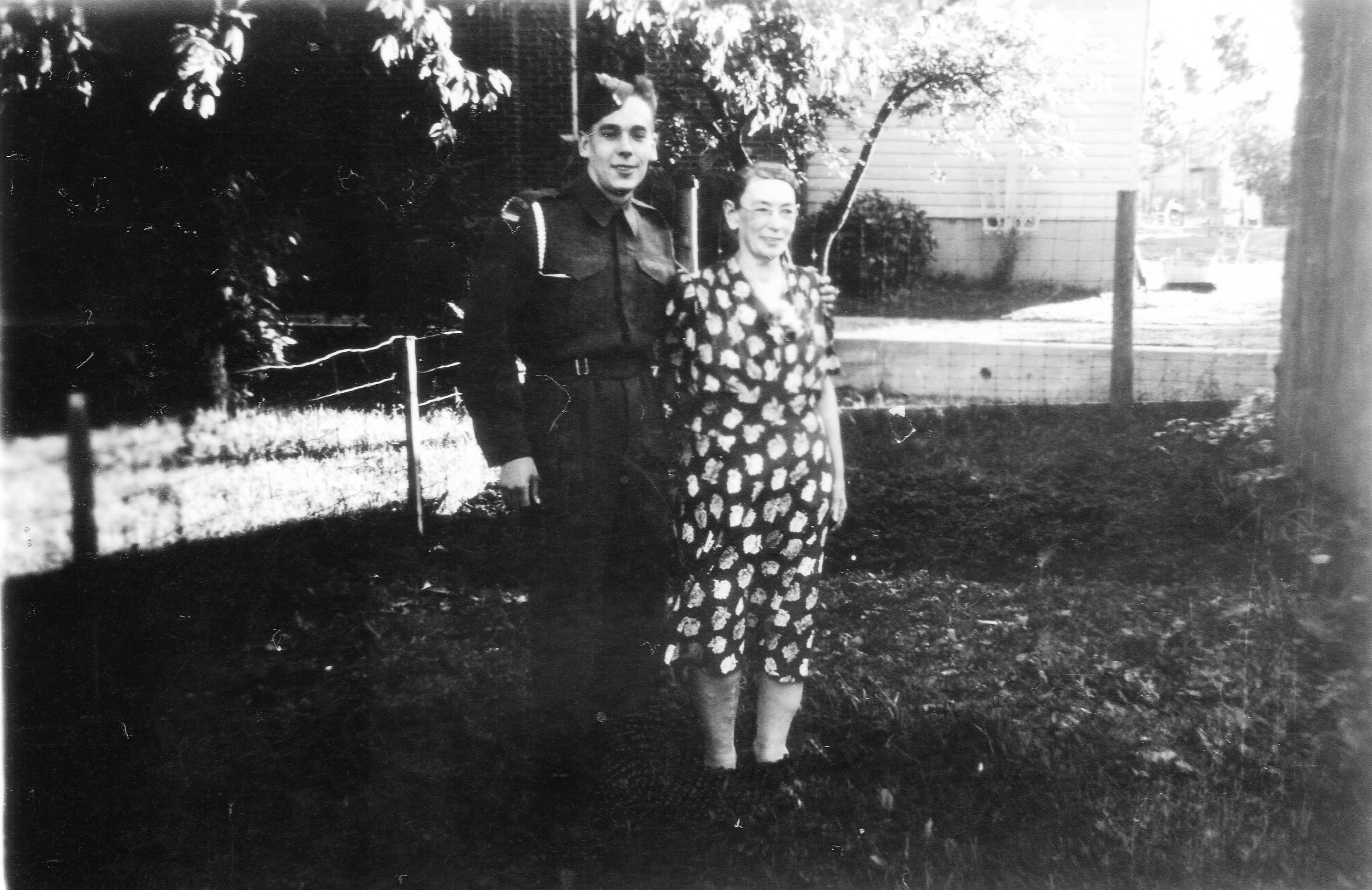 Photograph of Earl Guelph Warnica (1923-1996) in a uniform with his mother, Pearl Soules (1887-1956) taken on Guest Road, Big Bay Point, Innisfil. Earl married Mary Komoski and they had one child, Ernest. Earl was a World War II veteran and was one of 6 survivors of a bombing raid made by the U.S. Air Force by mistake, on his men. Earl was Bombed for over two hours by the Americans and not allowed to return fire. After the war Earl was based in Holland for a year, driving fuel trucks into Germany for the Allies. He also had a street named after him, Warnica Drive, in Kawartha Lakes, Ontario. Earl built many houses in Innisfil and in the Kawartha Lakes area.