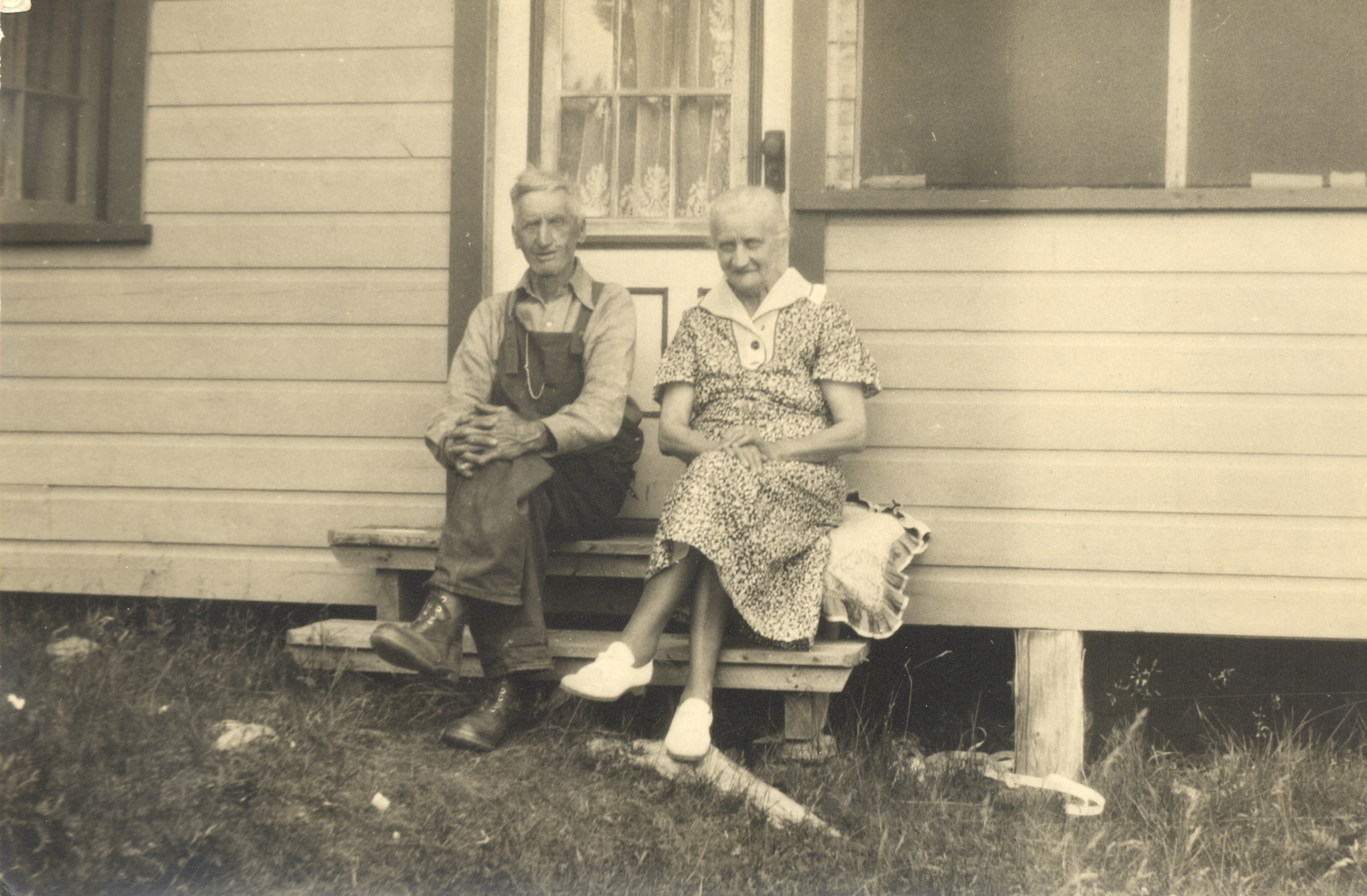 Photo of William Robert "Bob" Warnica ( and his sister Gertrude Quantz (née Warnica) sitting on the steps of the home built by their father, George Frederic Hanning Warnica (known as Hanning, 1837-1915). The house was located on the south half of lot 13, concession 13 of Innisfil, or what is today 504 Big Bay Point Road. The house was later home to Bert and Barb McCracken.