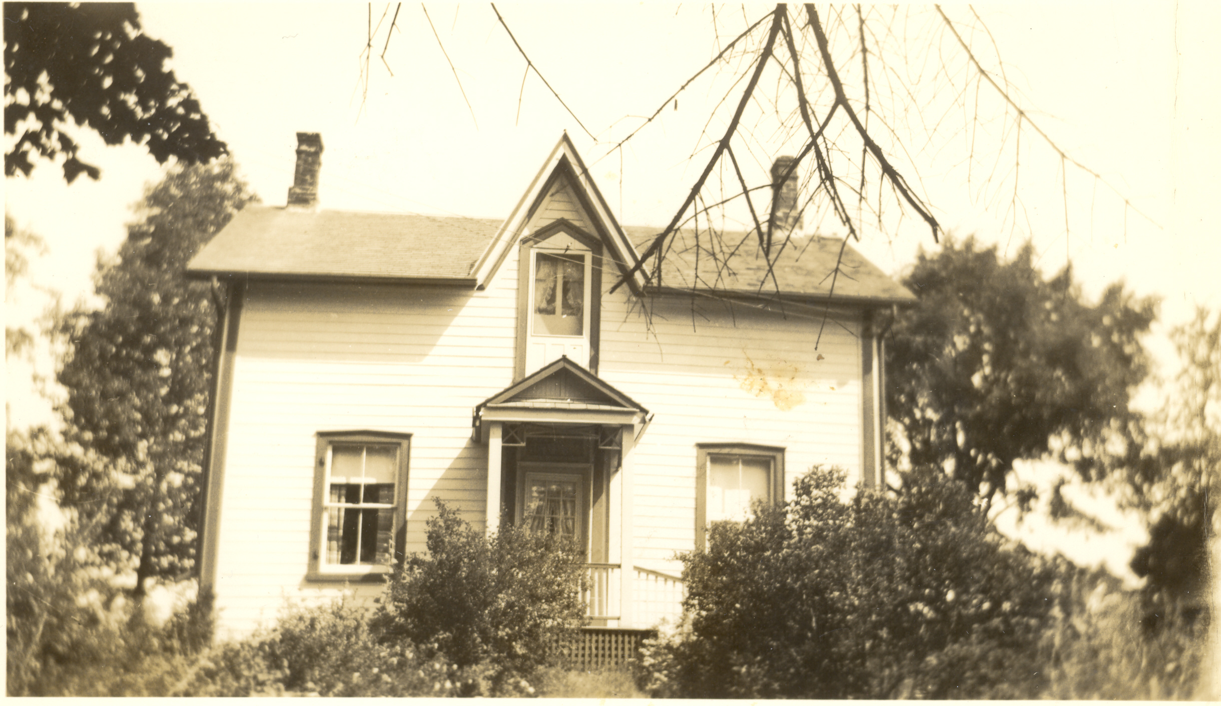 Photo of the front exterior of the Hanning Warnica house while it was owned by his son, William Robert "Bob" Warnica. The house features a covered front porch with windows on either side of the main door with another above it, and two chimneys. The house was located on lot 13 of concession 13 in Innisfil, or what is today 504 Big Bay Point Road. The house was painted white in the late 1930s and the gingerbread trim was removed.