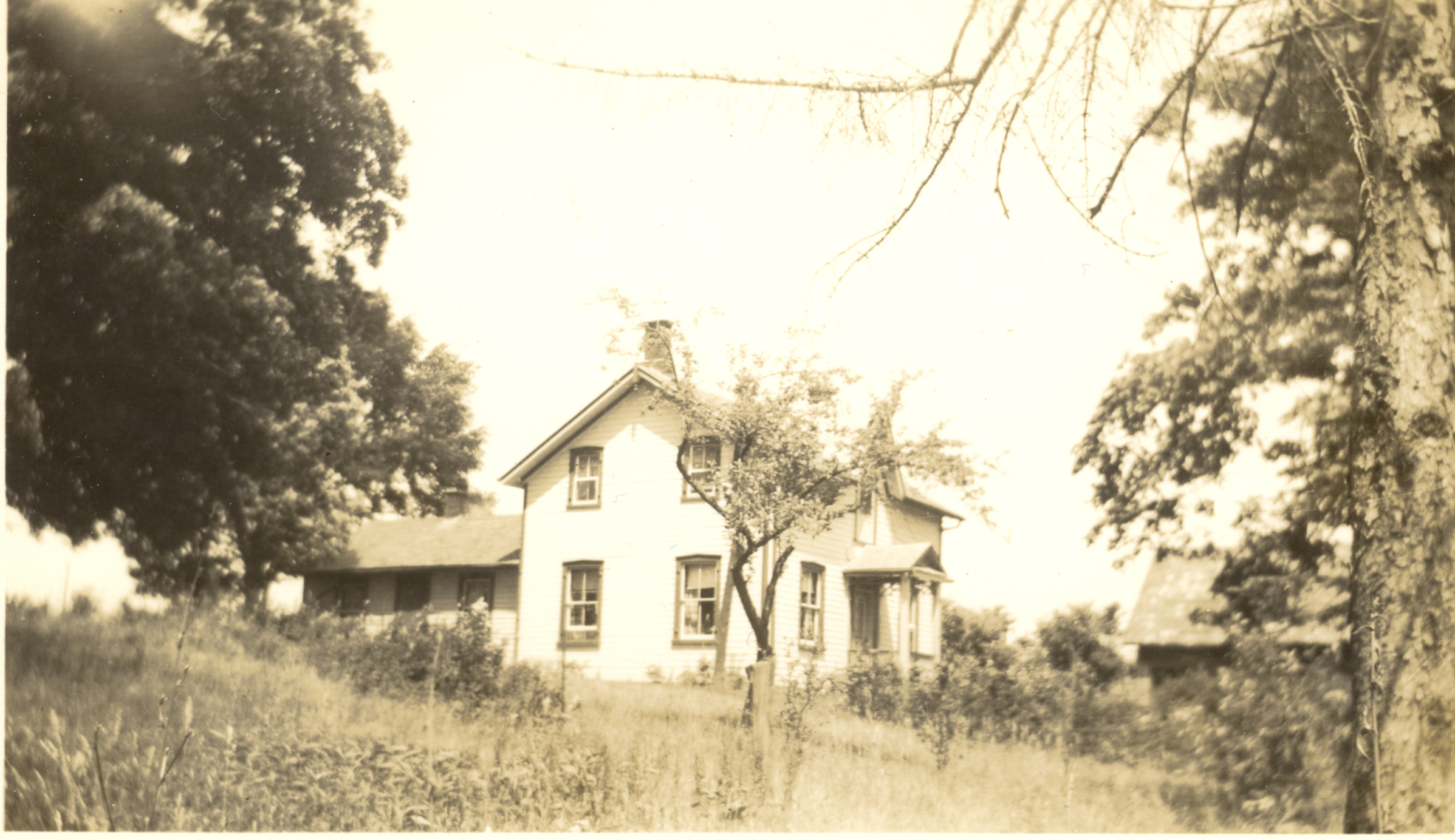 Photo of the side exterior of the Hanning Warnica house while it was owned by his son, William Robert "Bob" Warnica. The house features a covered front porch with windows on either side of the main door with another above it, and two chimneys. The house was located on lot 13 of concession 13 in Innisfil, or what is today 504 Big Bay Point Road. The house was painted white in the late 1930s and the gingerbread trim was removed.