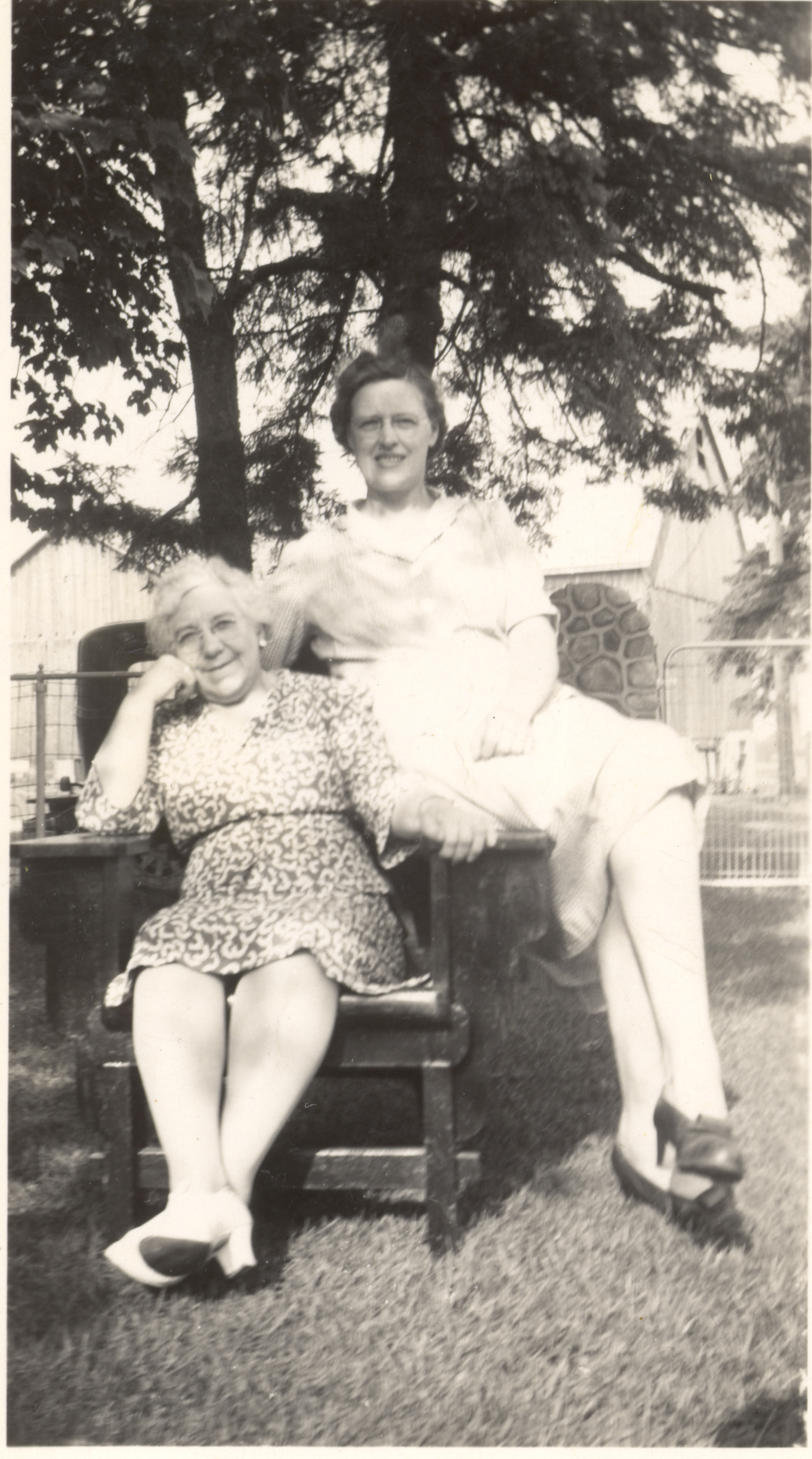 Photo of Jean Warnica (née Loudon, 28 August 1884 - 13 May 1964) with Joyce Warnica (née Carr) the wife of William Andrew Warnica (1889-1973) who had the neighbouring farm on Big Bay Point Road, which is now subdivided to include Pine Drive, Cedar Crescent, Spruce Crescent and so on. The photo shows Jean sitting on a wooden chair with Joyce perched on the arm of the chair in front of a large tree.