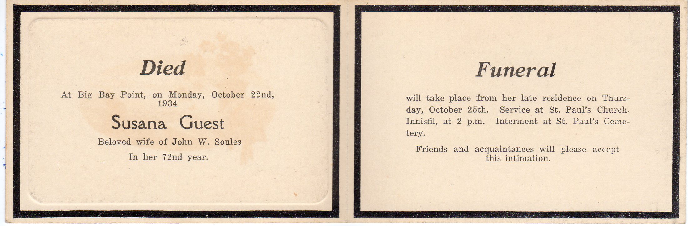 Scan of the funeral card distributed for Annie Susana Guest, wife of John William Soules. The card reads: "Died At Big Bay Point, on Monday, October 22nd, 1934 Susana Guest Beloved wife of John W. Soules In her 72nd year. Funeral will take place from her late residence on Thursday, October 25th. Service at St. Paul's Church, Innisfil, at 2 p.m. Interment at St. Paul's Cemetery. Friends and acquaintances will please accept this intimation." Annie Susana Guest (sometimes spelled Susanah) was born on 24 January 1863 on the family farm located on lot 25, concession 13 in Innisfil to James Fitten Guest (1818-1888) and Susan Robinson (1826-1903). On 16 December 1885 Susana married John William Soules, who lived across the road on lot 26. Together they farmed the west half of lot 26, concession 13, and had one child named Frankie Pearl Soules (1887-1956). Pearl married Samuel W.D. Warnica who took over the farm.