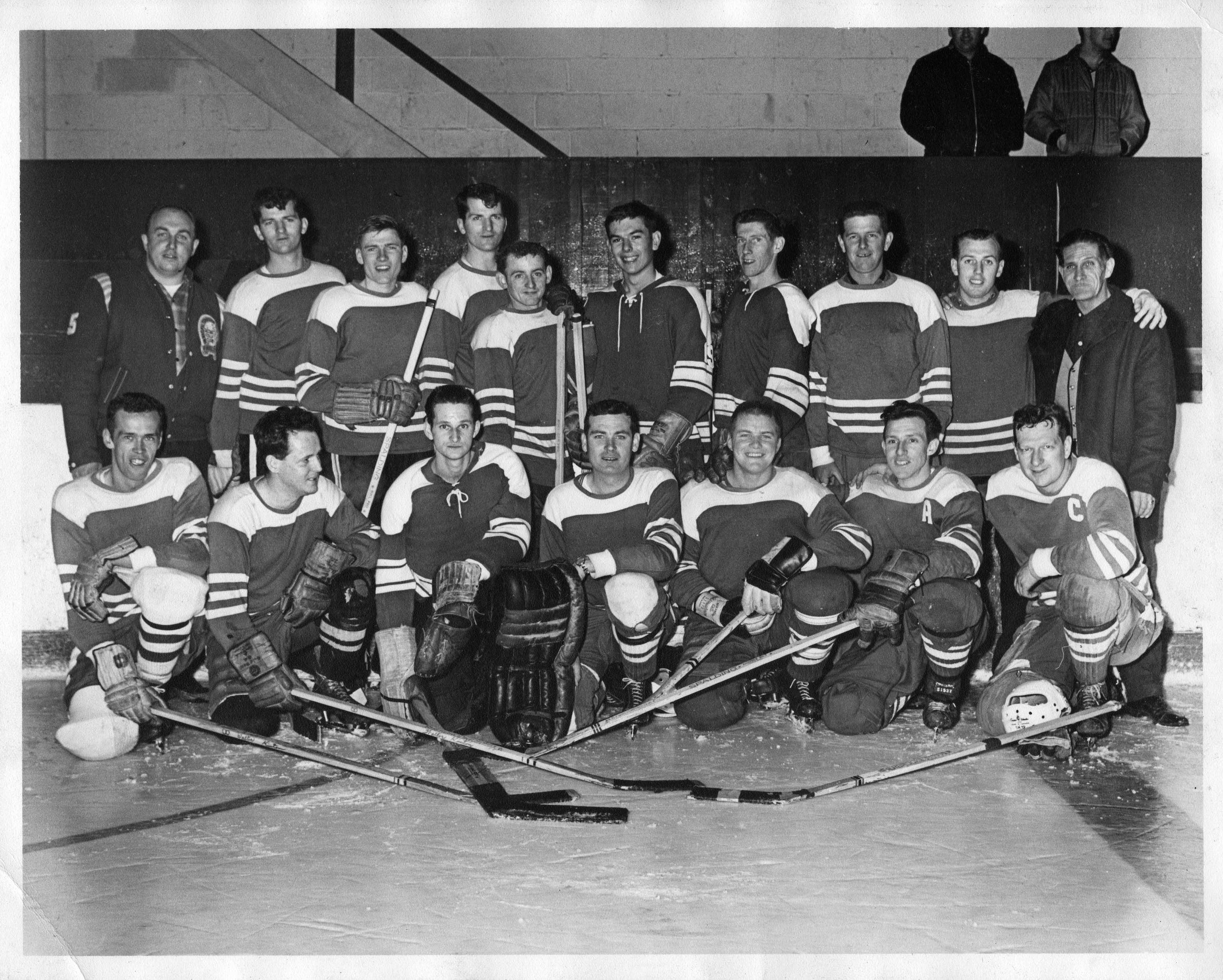 Group photo of the Innisfil Hockey team in an unknown year. Pictured from left to right, back row: Coach Vic Belton, unknown, Ken Green, two unknown, Ernie Warnica, and four unknown. Front row: Walter Kinton and six unknown.