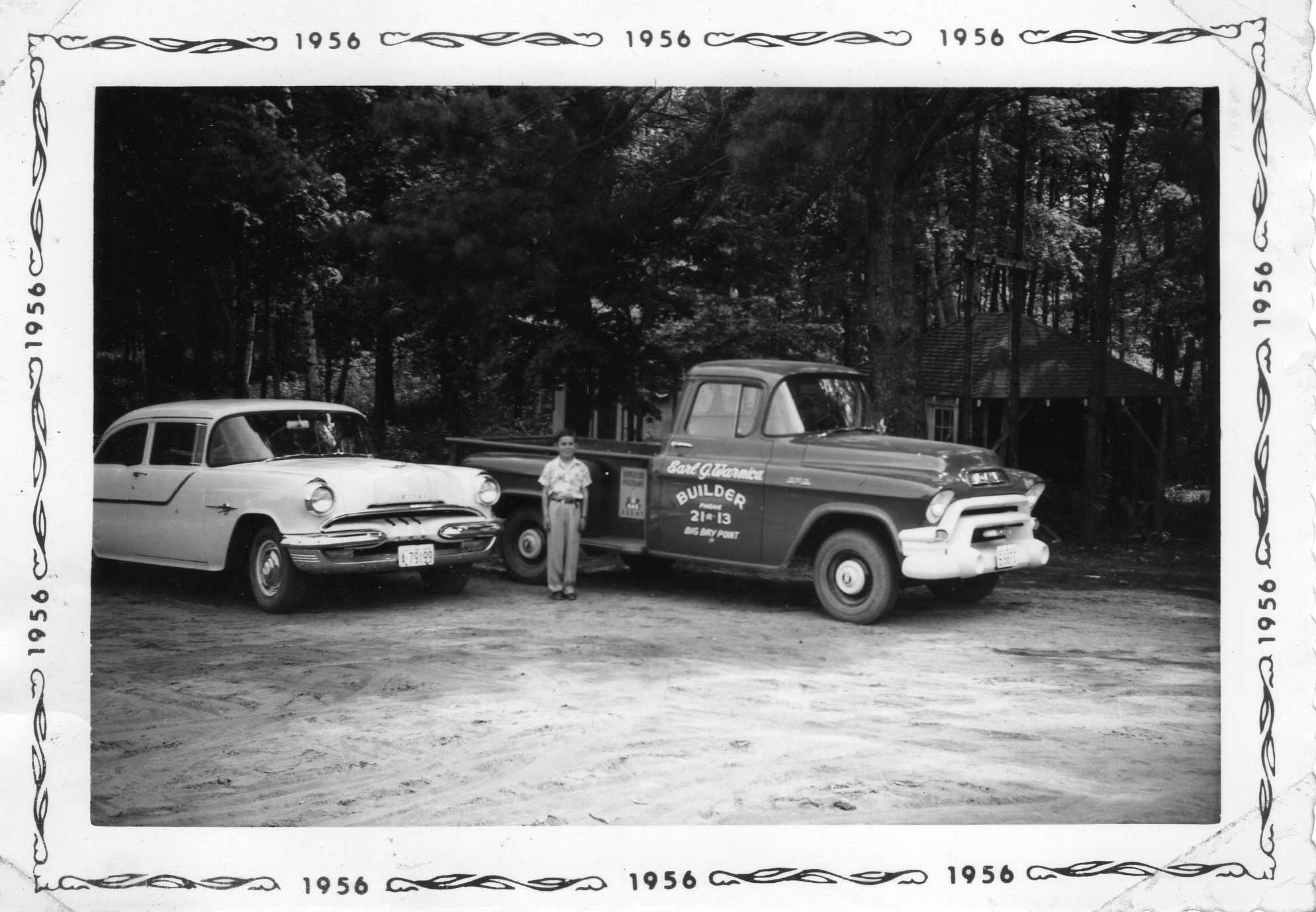 Photo of Ernest "Ernie" Harold Warnica as a boy standing next to his father's pickup truck. Painted on the side of the truck is "Earl G. Warnica Builder - Phone 21 R 13 Big Bay Point". Ernie was born on 2 March 1947 to Earl Guelph Warnica and Mary Komoski. He worked for Ram Forest Products in Vandorf, Ontario for many years until his passing on 30 October 2007.