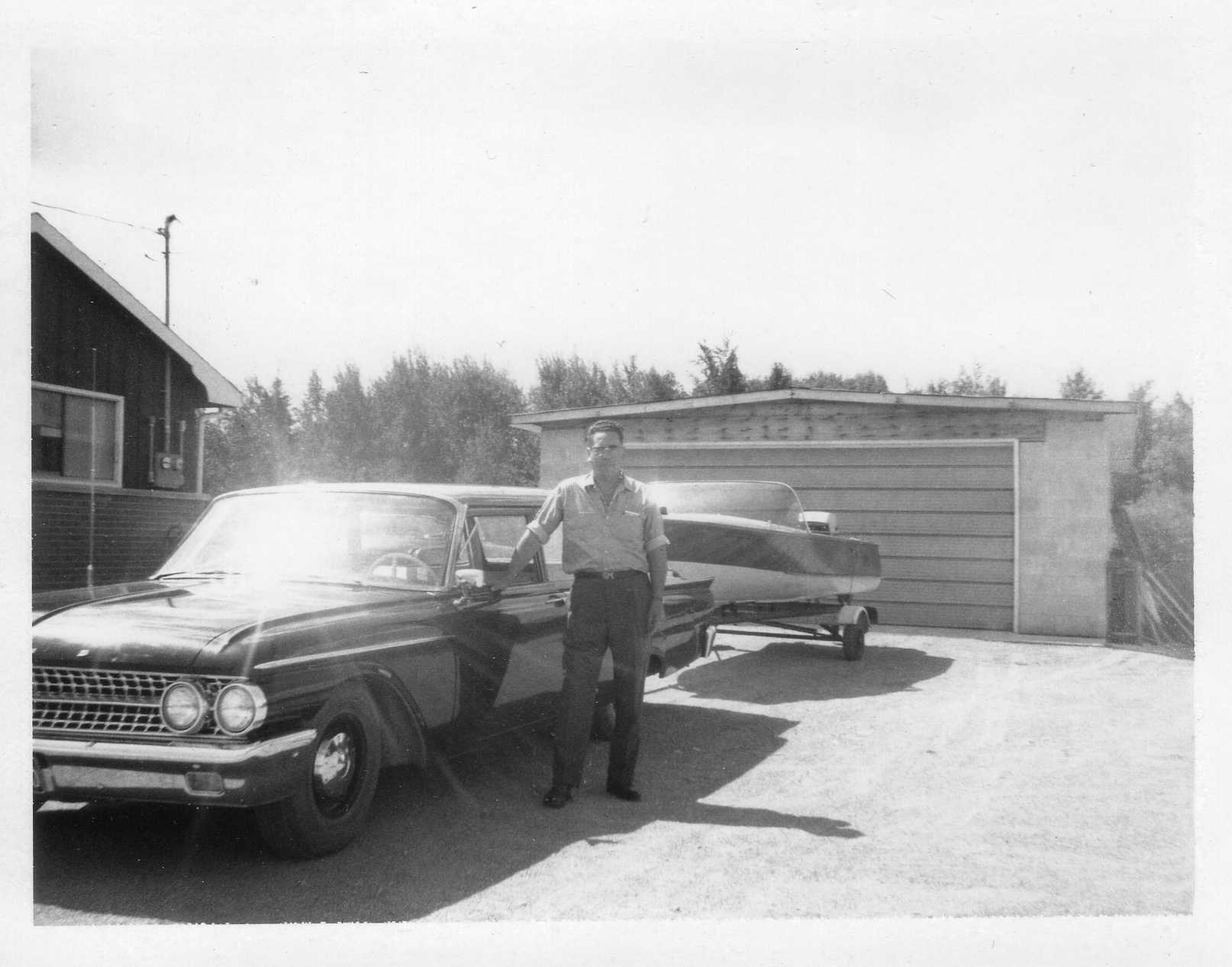 Photo of Earl Guelph Warnica (10 June 1923 - 21 March 1996) standing beside a car parked in a driveway hitched to a boat on a trailer. Earl was the son of Samuel Warnica and Pearl Soules. He married Mary Komoski and they had one child, Ernest. Earl was a World War II veteran and was one of 6 survivors of a bombing raid made by the U.S. Air Force by mistake, on his men. Earl was Bombed for over two hours by the Americans and not allowed to return fire. After the war Earl was based in Holland for a year, driving fuel trucks into Germany for the Allies. He also had a street named after him, Warnica Drive, in Kawartha Lakes, Ontario. Earl built many houses in Innisfil and in the Kawartha Lakes area.