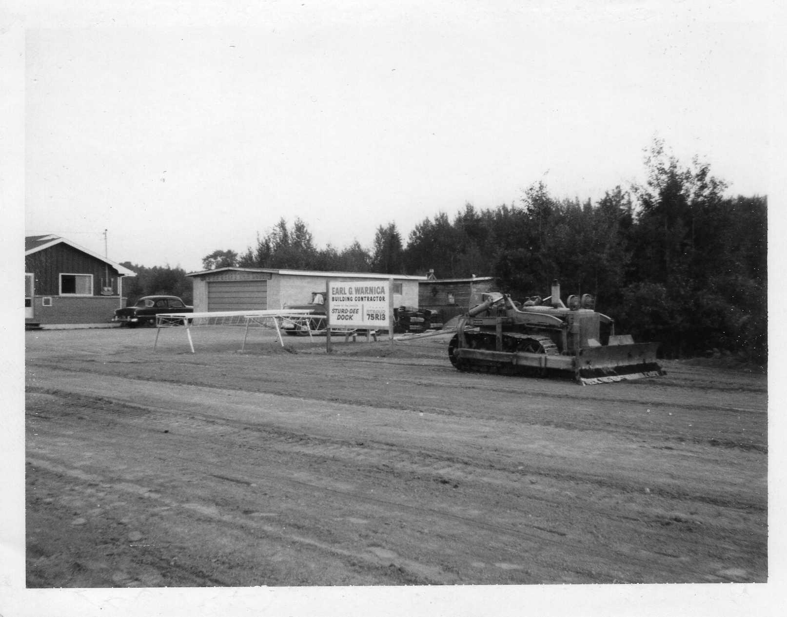 Photo of the advertising signage for Earl G. Warnica, Building Contractor. The sign also reads "STURD-DEE DOCK" and gives the phone number for the business as Stroud 75R13. A piece of construction equipment is parked beside the sign, and a large garage with a car parked in the driveway are visible behind the sign. Earl Guelph Warnica (10 June 1923 - 21 March 1996) was the son of Samuel Warnica and Pearl Soules, and married Mary Komoski and they had one child, Ernest. Earl was a World War II veteran and was one of 6 survivors of a bombing raid made by the U.S. Air Force by mistake, on his men. Earl was Bombed for over two hours by the Americans and not allowed to return fire. After the war Earl was based in Holland for a year, driving fuel trucks into Germany for the Allies. He also had a street named after him, Warnica Drive, in Kawartha Lakes, Ontario. Earl built many houses in Innisfil and in the Kawartha Lakes area.