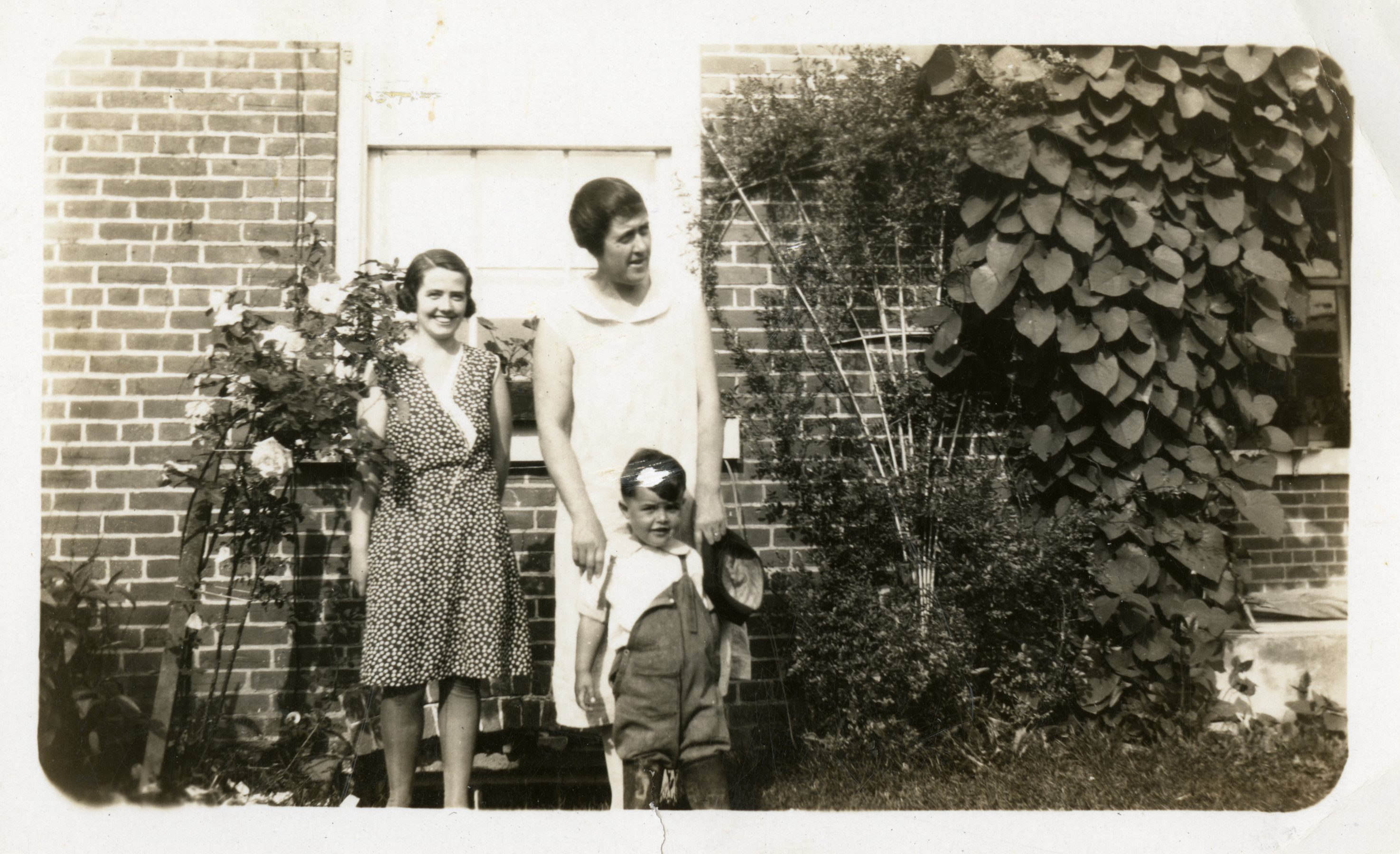 Photo of Treva Rowe (née Lennox) standing in front of a window outside of a brick house. Left of her is Mina Henderson and in front is her son, Howard Lennox (known as Lennox). Treva was the wife of Earl Rowe whose political started as reeve of the township of West Gwillimbury from 1919 to 1923. Rowe then served as a Member of Provincial Parliament from 1923 to 1925, and was later elected to the House of Commons, where he served until 1935. From 1936 to 1938, he was leader of Conservative Party of Ontario though, as he did not have a seat in the legislature George S. Henry remained Leader of the Opposition. He also served as Ontario's twentieth lieutenant governor from 1963 to 1968. His daughter Jean was also a Member of Parliament and from 1958 to 1962 Earl and Jean were the only father and daughter to sit together in parliament. Jean Casselman Wadds also served as Canadian High Commissioner to the United Kingdom from 1979 to 1983, playing a role in the government of Pierre Trudeau's negotiations with the British government of Margaret Thatcher in Trudeau's successful effort to patriate the Canadian Constitution in 1982. The Rowe family lived on a farm in Newton Robinson, and Treva remained close with Welhelmina "Mina" Henderson, whom the family had hired to help with running the household from 1928/9 until 1932. This photo was donated by Mina's daughter, Elizabeth Carson.