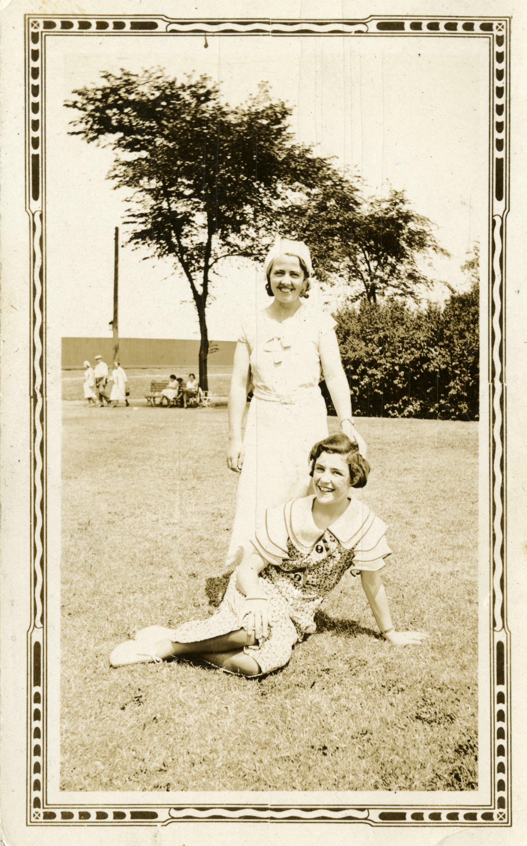 Photo of Wilhelmina "Mina" Henderson (standing) and Jean Rowe (later Jean Casselman Wadds) at a park in the summer. Both girls are wearing dresses with a beach and a small group of people around a picnic table visible in the background. Jean was the daughter of William Earl Rowe. During his political career, Earl Rowe served as reeve of the township of West Gwillimbury from 1919 to 1923. Rowe served as a Member of Provincial Parliament from 1923 to 1925, and was then elected to the House of Commons, where he served until 1935. From 1936 to 1938, he was leader of Conservative Party of Ontario though, as he did not have a seat in the legislature George S. Henry remained Leader of the Opposition. He also served as Ontario's twentieth lieutenant governor from 1963 to 1968. His daughter Jean was also a Member of Parliament and from 1958 to 1962 Earl and Jean were the only father and daughter to sit together in parliament. The Rowe family lived on a farm in Newton Robinson, and Earl's wife Treva remained close with Mina Henderson, whom the family had hired to help with running the household from 1928/9 until 1932. This photo was donated by Mina's daughter, Elizabeth Carson.