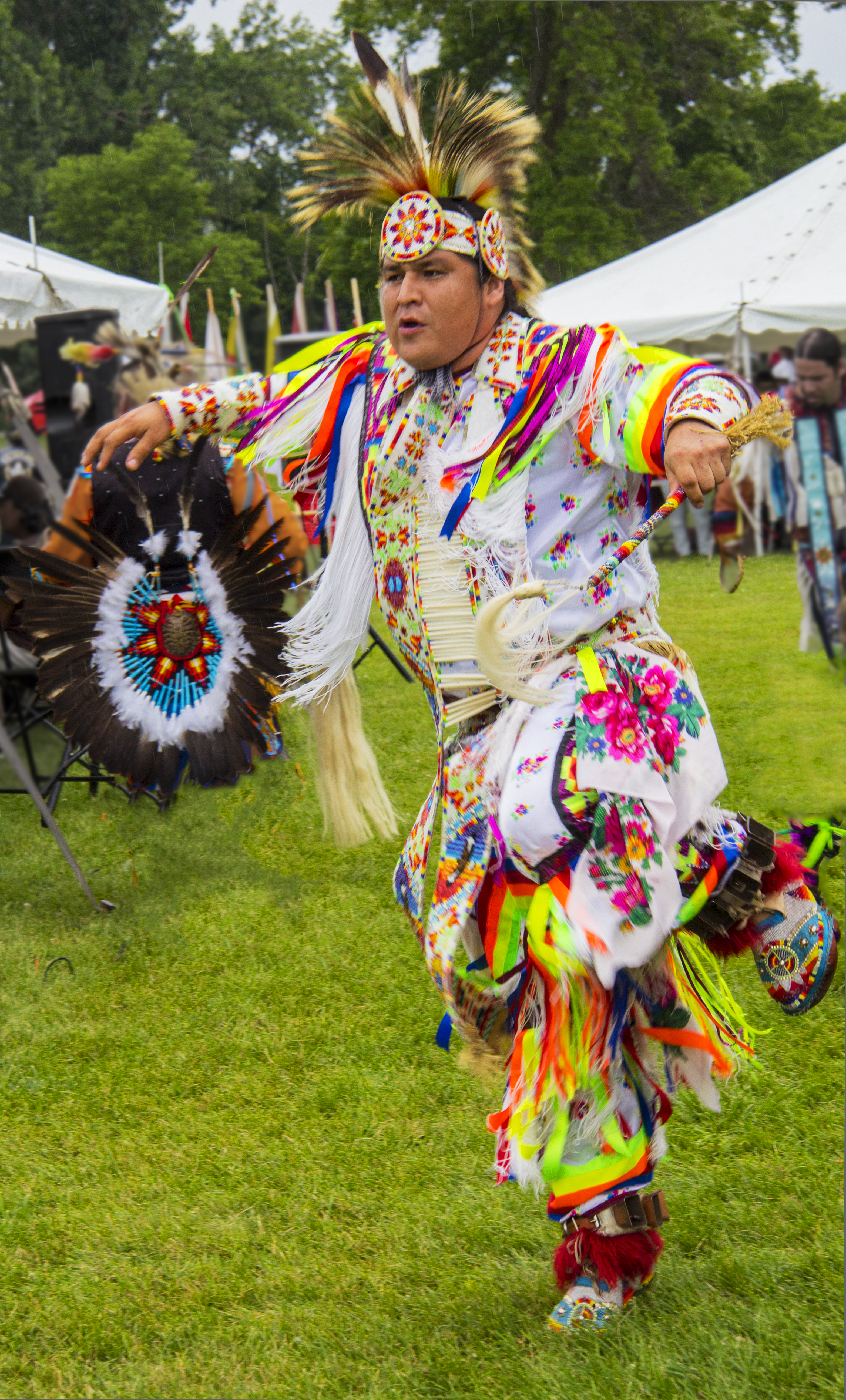 Image of a male dancer in motion wearing white regalia with neon accents at the 2017 Celebrate Lake Simcoe Pow Wow at Innisfil Beach Park on 22 July 2017. Photograph taken by Gordon Wright.