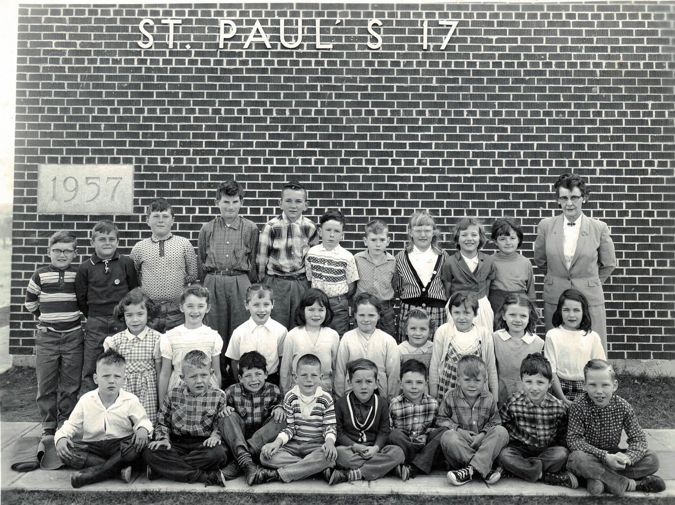 Junior room class photo taken outside of St. Paul's School for the 1960-61 school year. Pictured from left to right, front row: Tommy ??, Ken Rowlandson, two unknown, Larry Durkee, Richard Green, Robin Robertson, Mike Emms, and Cecil Mendel. Middle Row: Darlene Fralick, Ann Booth, Joanne Emms, two unknown, Norma Skinner, Susan Taylor, and two unknown. Back row: Bob Knowles, Greg Owens, Jim Owens, Bobby Madle, David Barber, Stan Barber, Donald Bowman, Margot Pratt, Lorraine Skinner, unknown, and Mrs Bernice Sutherland (teacher).