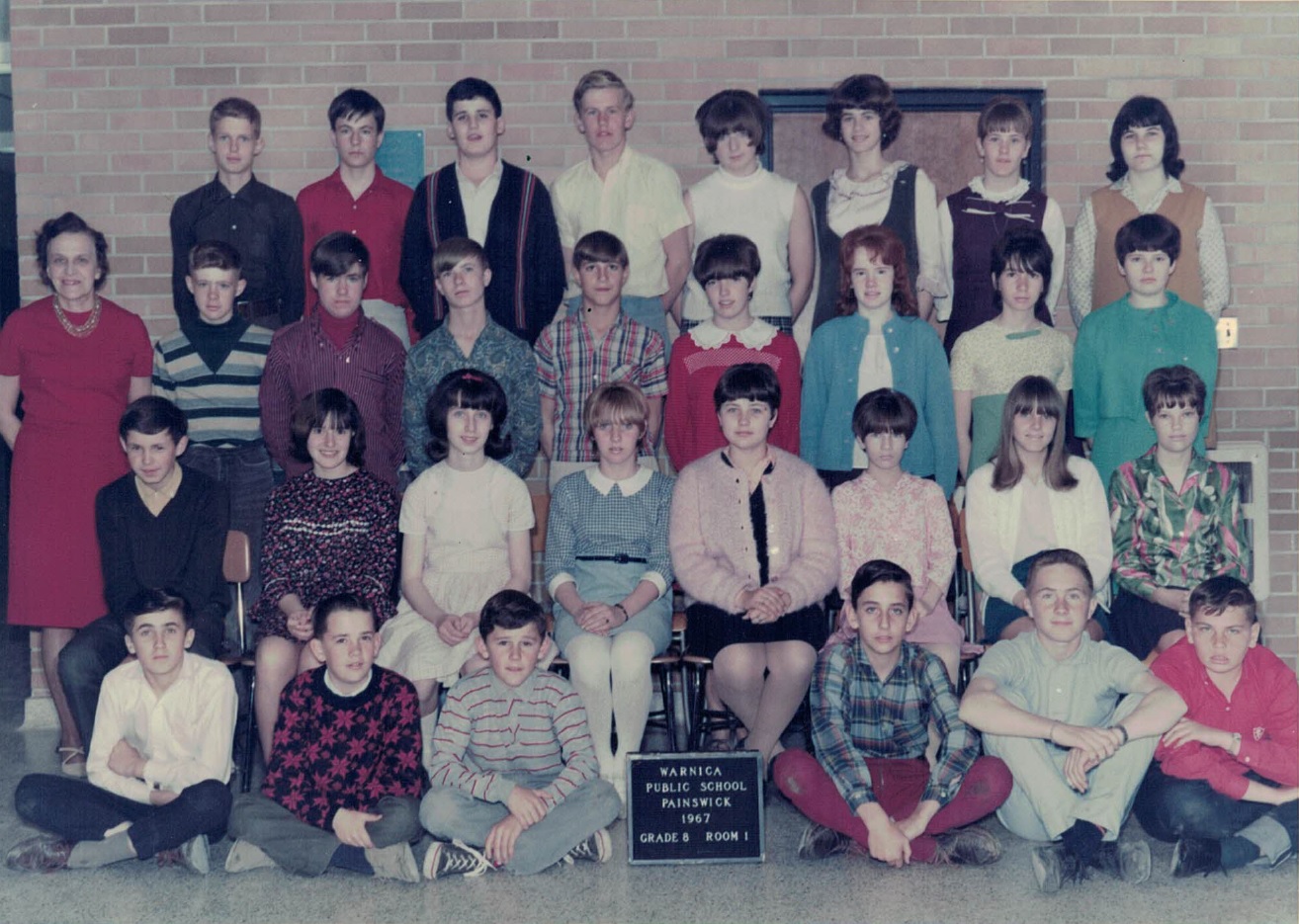Grade 8 room 1 class photo taken inside of Warnica Public School in Painswick for the 1966-67 school year. Pictured from left to right, front row: Chris Luchkiw, Larry Durkee, Rodney Howard, Ken Price, Wayne Sanford, and Robert Quick. Second row: Evert Heskes, Karen Webb, Joanne Emms, Linda Terry, Bernadette Dorian, Kathy Patterson, Susan Harbridge, and Brenda McArthur. Third row: Mrs. Elda Shannon (teacher), Donnie Lennox, Jim Oakes, Richard Tobin, Bert Carlson, Judy Jones, Madeline Reynolds, Susan Miller, and Heather Reid. Back row: Bob Sheard, Eddie Small, Chris Hammond, Jan Jensen, Colleen Jacklin, Carolyn Hofman, Debbie Monger, and Judy King. Absent: Judy Kosowan.