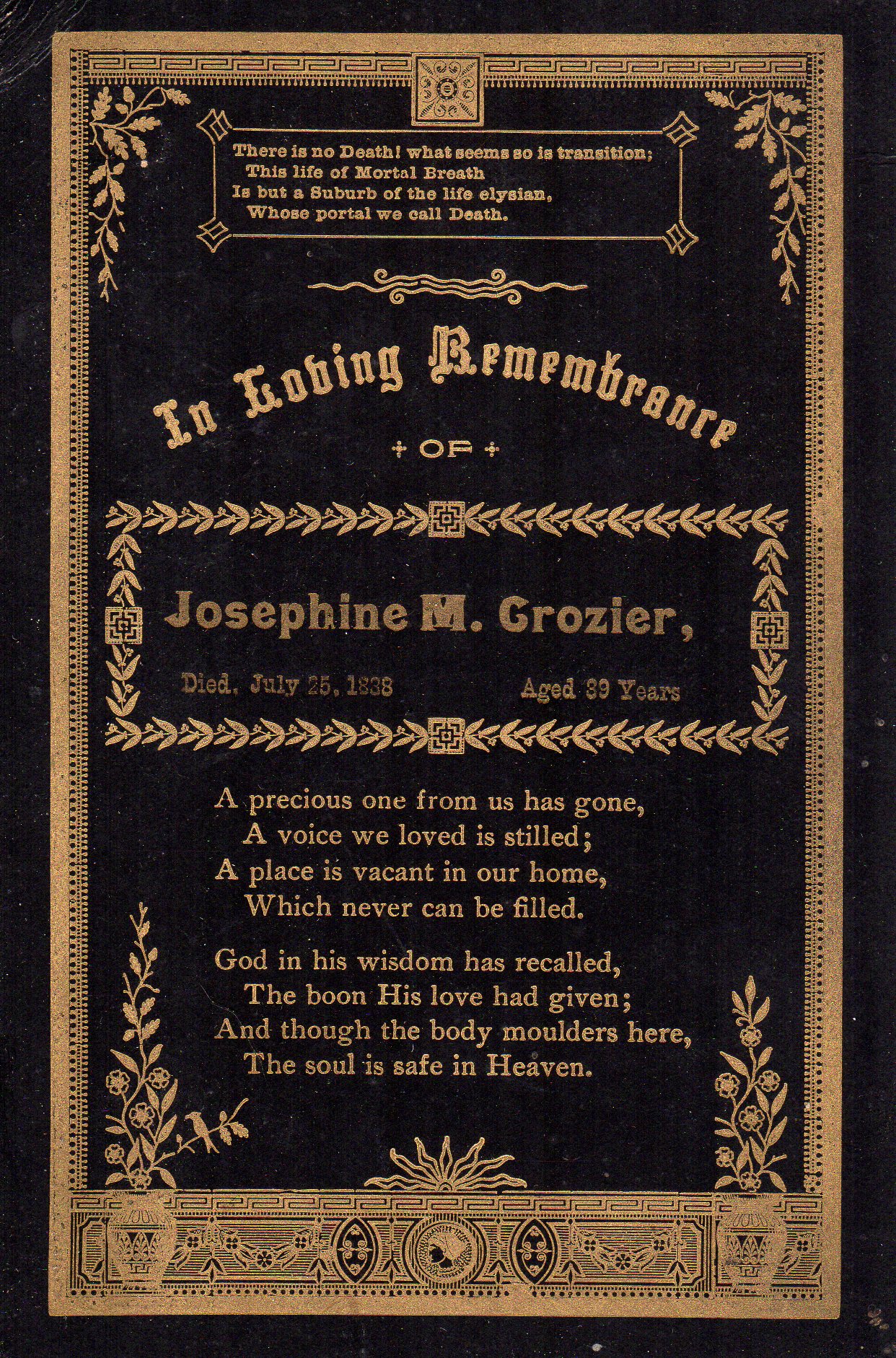 Funeral card for Josephine "Josie" Margaret Crozier, née Warnica who was born on 11 March 1850 to William Daniel Warnica and Sarah Orchard on the 11th Line of Innisfil. She married William James Crozier on 2 October 1872 at St. Paul's Church in Innisfil, and shortly after the couple moved to Wisconsin. There they raised three children: Daniel James "Harvey" Crozier, Leah Sarah Margaret Crozier, and William J. Crozier. Josie passed away on 25 July 1888 from cancer and was interred in the Evergreen Cemetery in Oconto, Wisconsin. The funeral card text reads: "There is no Death! what seems so is transition; This life of Mortal Breath is but a Suburb of the life elysian, Whose portal we call Death. - In Loving Remembrance of Josephine M. Crozier, Died. July 25, 1888 Aged 89 Years. A precious one from us has gone, A voice we loved is stilled; A place is vacant in our home, Which never can be filled. God in his wisdom has recalled, The boon His love had given; And though the body moulders here, The soul is safe in Heaven." The card is black with ornate gold borders and illustrations.