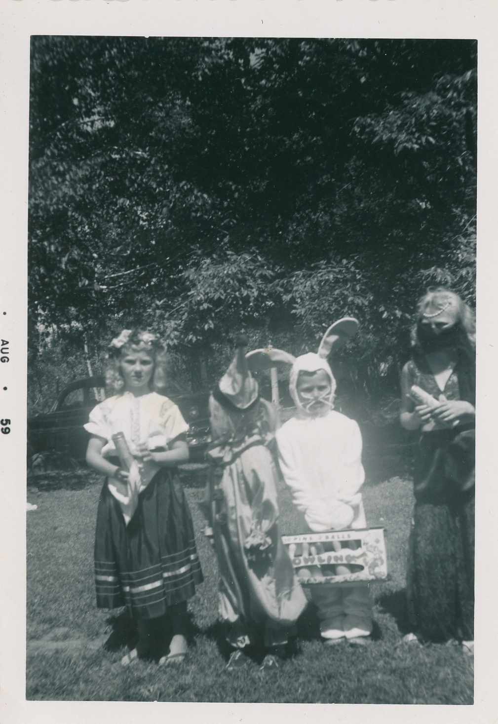 Photo of four children in costume before the Alcona Beach Club parade of August 1959. From left to right are Lenore, Janet, Billy, and Linda.