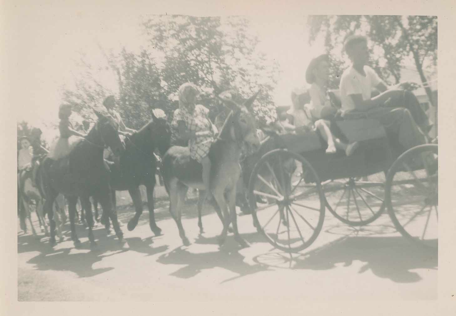 Photo of several people on horseback, two on donkeys, and three people in a wagon participating in a parade hosted by the Alcona Beach Club, date unknown.