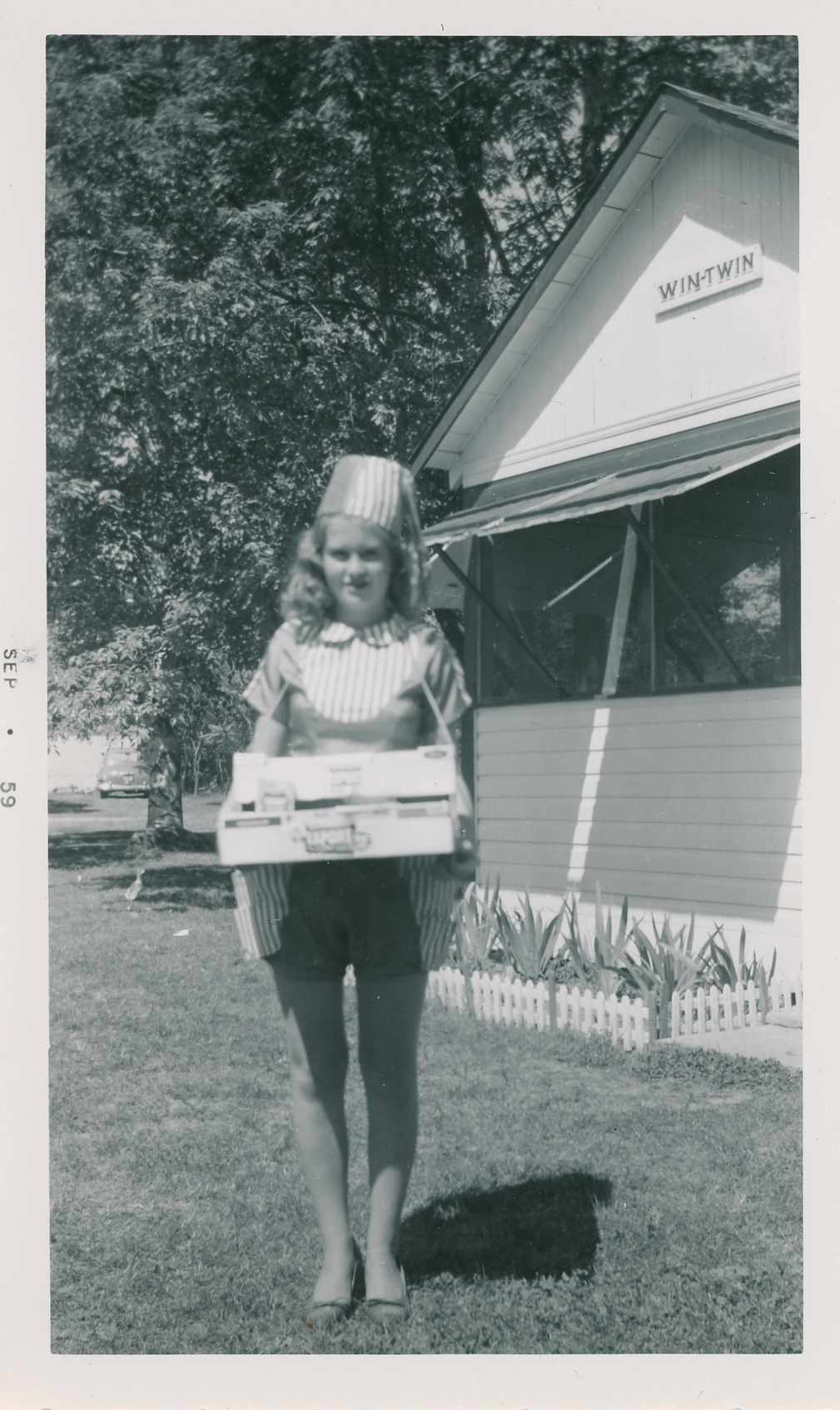 Photo of a young woman identified as "Darlene" wearing a costume or uniform for the Alcona Beach Club parade of September 1959. She is standing in front of Win Twin Cottage and is holding a tray of snacks.