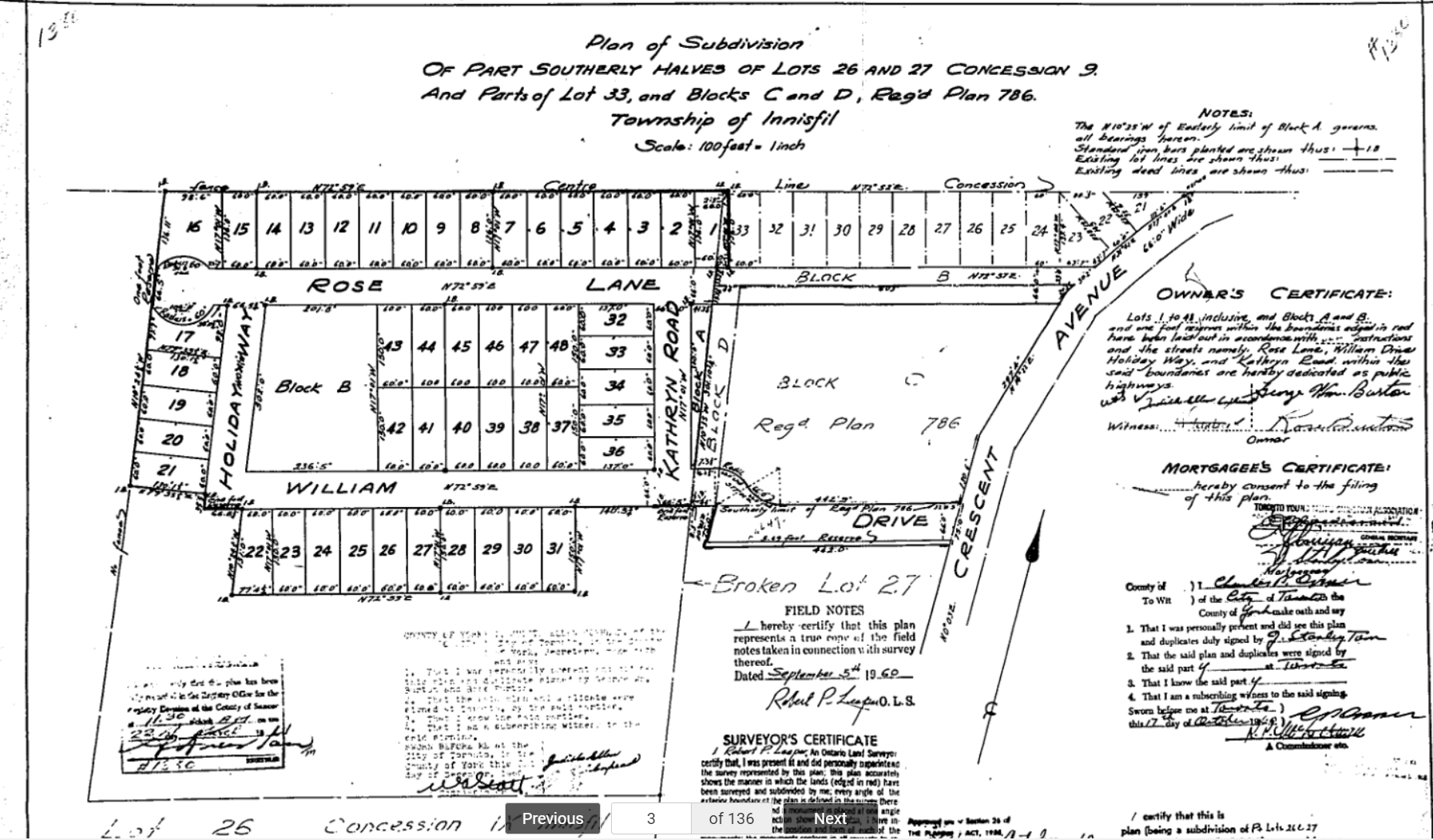 Plan #786 for subdividing lots of 26 and 27 on the 9th Concession of Innisfil into 36 smaller lots, which was approved on 5 September 1960. This plan was drawn up by George Burton, and the names Rose Lane, Kathryn Road, William Drive, and Holiday Way make reference to George's wife rose, children Kathryn and William, and the lot as former site for Holiday Acres Camp. William Drive is now named Burton Drive. George Burton ended up running for the position of Reeve, and winning, in order to combat Innisfil council's proposed $100 levy (later $500) for each lot sold. George served as Reeve from 1969 until 2 December 1974.