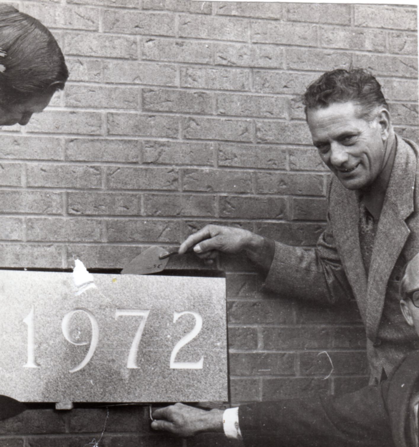 Photo of Innisfil Reeve George William Burton at the laying of the last stone for the Innisfil municipal building, which he had helped design. This building was located closer to the intersection of Innisfil Beach Road and Yonge Street than the current municipal building located at 2101 Innisfil Beach Road. George Burton served as Reeve in Innisfil from 1969 until 2 December 1974. George was born on 1 October 1919 and worked as a builder, contractor, and operated a fishing hut business at Leonard's Beach. He also owned and operated a holiday resort known as Holiday Acres, and was responsible for subdividing the resort into smaller lots in the south half of lots 26 and 27 on the 9th Line of Innisfil. Located in this subdivision are Rose Lane, which is named for his wife, Kathryn Road is named for his daughter, and Holiday Way is named after the resort. Burton Drive was formerly named William Drive, for his son.